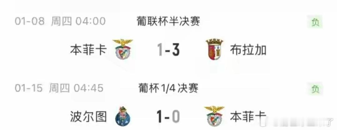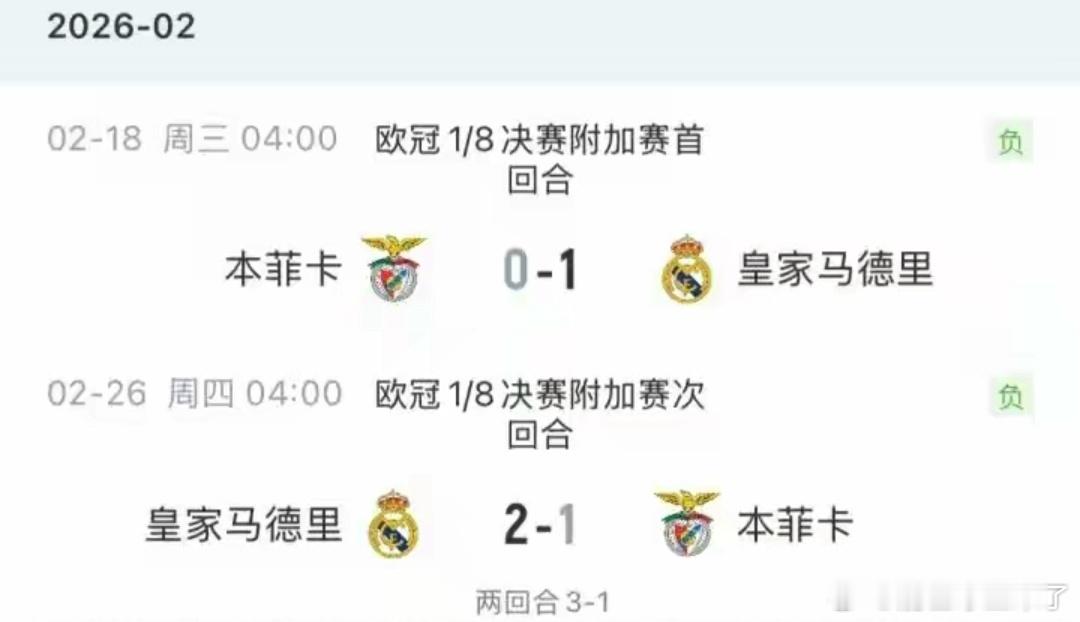 02月26日讯 穆帅遭禁赛大巴观战!本菲卡不敌皇马,欧冠出局+一月内三线崩盘皇马足球 02月26日讯,欧冠1/8决赛附加赛次回合,本菲卡客场1-2不敌皇马,两回合总比分1-3,无缘欧冠16强。本场比赛,本菲卡主帅穆里尼奥因禁赛,只能在球队大巴内观看比赛。去年9月,穆里尼奥从费内巴切下课之后,正式出任本菲卡主教练。但进入2025年以来,本菲卡接连在杯赛赛场折戟,遭遇三线出局。1月8日,葡联杯半决赛,本菲卡1-3不敌布拉加;1月15日,葡萄牙杯1/4决赛,本菲卡客场0-2负于里奥阿维;2月26日,欧冠附加赛次回合,本菲卡1-2不敌皇马,总比分1-3出局。联赛赛场上,本菲卡本赛季表现相对稳定,16胜7平保持不败,积55分暂列联赛第三,距离榜首波尔图仍有7分差距。