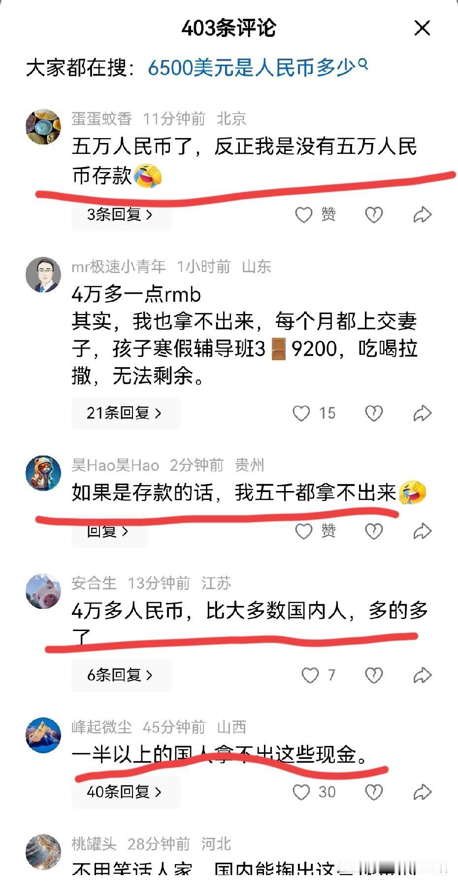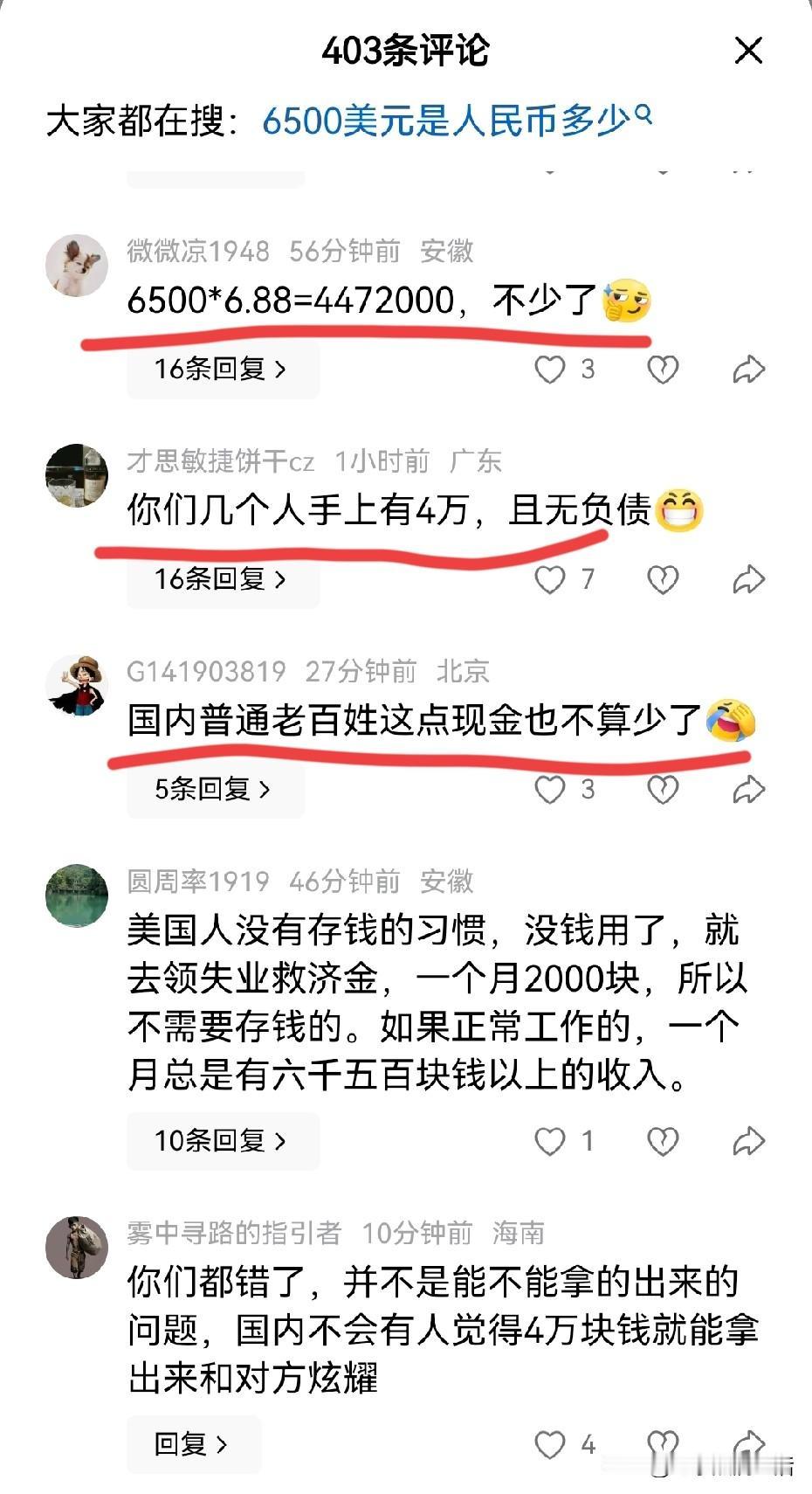 这事儿扎了谁的心? 美国沃尔玛两个人吵架都骂对方穷鬼,一个女士直接亮出自己的存款余额,6504.85美元在美国应该可以碾压很多人了吧,不然她也不会这么自信又骄傲的向别人展示吧。 评论区更是很多人跟着说不少了,说咱们国内应该很多人也拿不出这么多现金吧,怎么忽然感觉自己又回到20年前了呢,那时候每月工资不到两千,能拿出来6500确实是巨款了。 不过很多人却说成是4万多,给默认换成人民币了,这是不对等的,除非她能美国挣钱中国花,不然她6500美元在美国的购买力,和我们6500人民币在国内的购买力基本差不多。 看到这余额,又恍惚记得哪位公知不是说美国人的平均工资是8000美元吗?