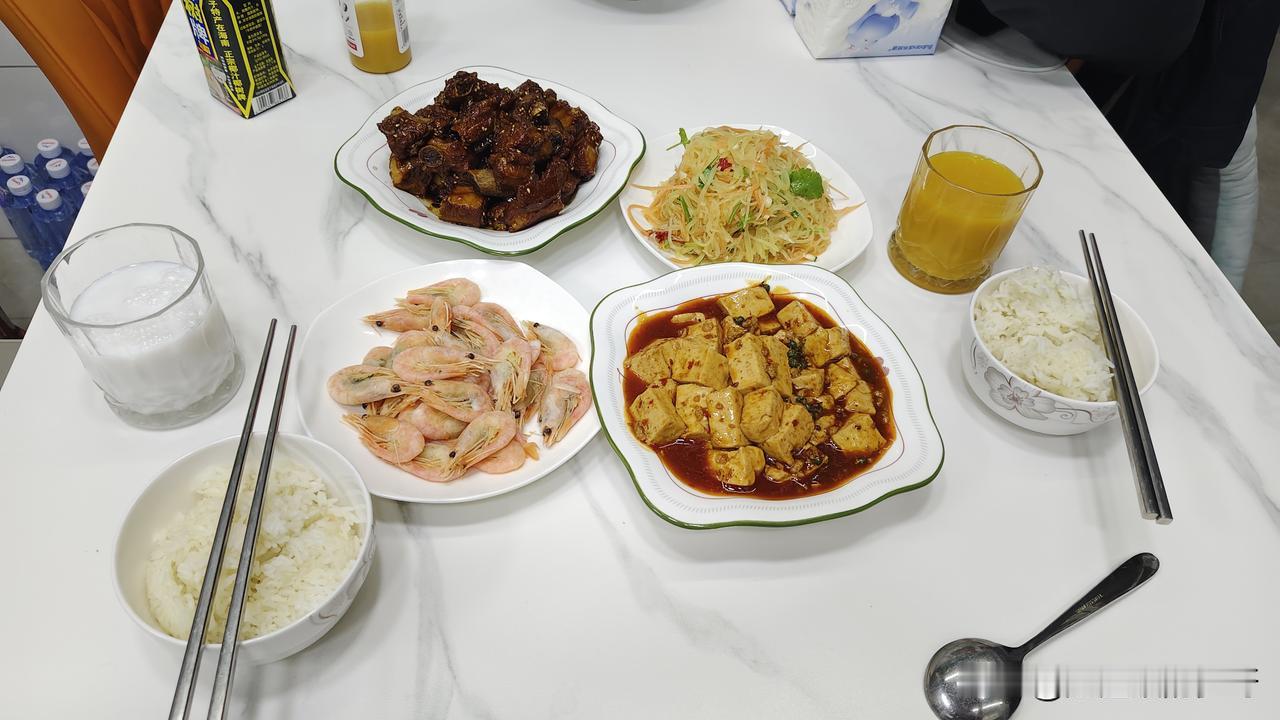 老母亲给大二的娃做的晚餐 一个月的假期结束了 明天女儿就要出发了 提议和女儿出去吃 娃非要让我给做 和女儿去了菜市场采购食材 她点了糖醋排骨和麻婆豆腐 再加一个冰虾和炝拌土豆丝 四个菜出炉了 配上东北特有的长粒香大米 完美 女儿表示非常满意 吃的那叫一个香呀