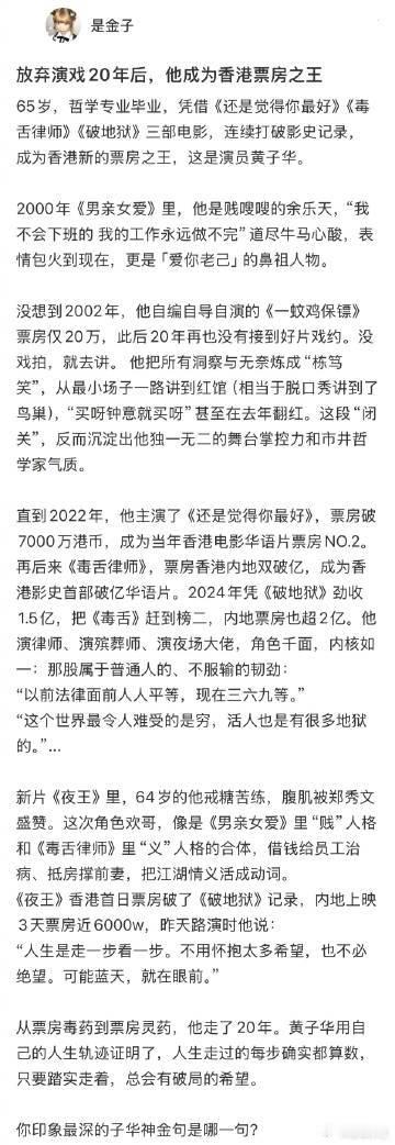 黄子华票房毒药变灵药走了20年逆袭剧本照进现实!黄子华 20 年熬走质疑,《夜王》票房口碑双丰收,曾经的冷遇都成勋章,子华神值得所有鲜花与掌声