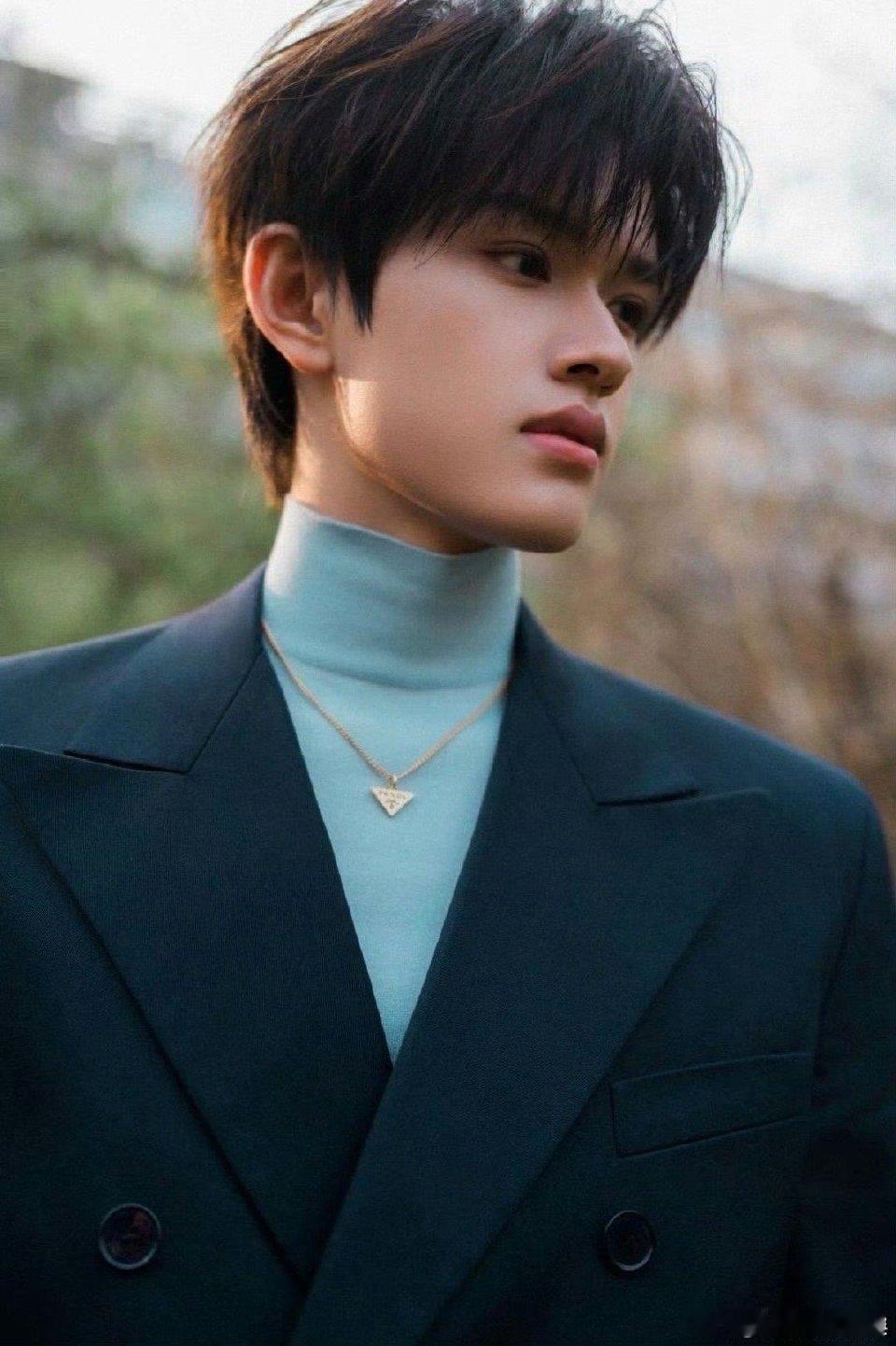 张极海军蓝suit造型张极高领毛衫 张极真的穿什么都好看,这套海军蓝西装剪裁特别合身,高领毛衫露出一点点领口,细节感满分。