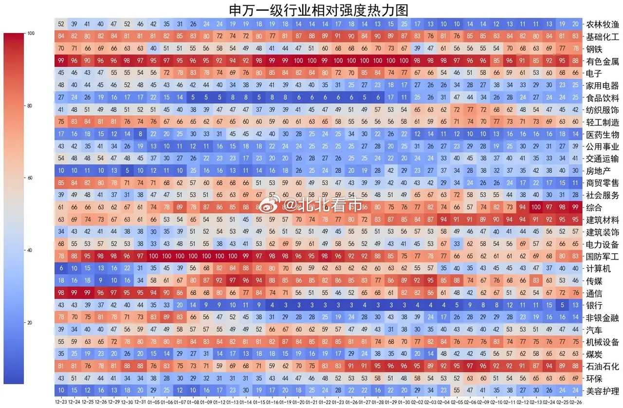 每个小格子代表某个行业在当天的强度,数值介于0-100之间,强度大于50者说明强于市场基准,值得多花一些精力。
