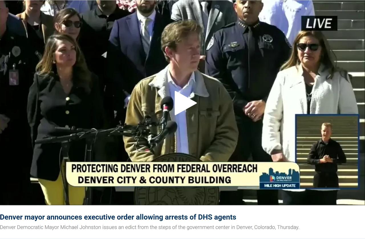 美国市长下令拘留执法过度的ICE特工 当地时间周四,美国科罗拉多州丹佛市长迈克·约翰斯顿宣布了一项行政命令,指示市政府相关部门对一名被认定对平民使用过度武力、或“袭击、开枪或杀害”平民的移民局工作人员实施拘留。 约翰斯顿说:“为了保护丹佛,我们的急救人员将始终为任何受伤者提供救命救助,无论伤害者是谁。没有ICE特工能阻挡我们拯救生命。为了保护丹佛,如果我们发现任何ICE特工对丹佛居民使用过度武力,我们将介入拘留并将其从现场带走。“ 约翰斯顿还表示他不会容忍ICE特工“绑架”居民:“无论联邦政府做什么,我们都不会放弃在我们城市起诉犯罪的责任。” 几周前,费城最高检察官拉里·克拉斯纳将ICE特工比作阿道夫·希特勒的国家警察,谴责ICE是“一小群想成为纳粹的人”,并承诺“我们必须像追捕纳粹几十年一样追捕你们,我们也会找到你们的身份。”