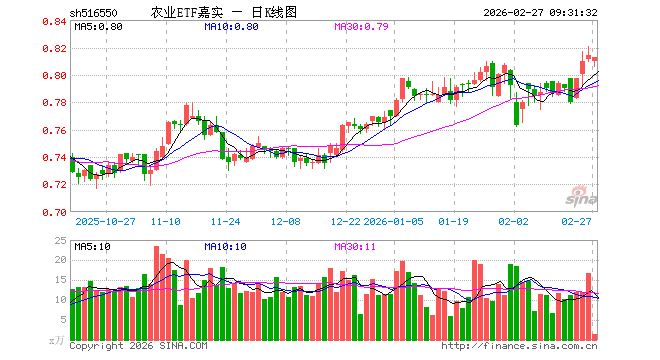 2月27日,农业ETF嘉实(516550)开盘跌0.49%,报0.810元。农业ETF嘉实(516550)重仓股方面,藏格矿业开盘跌1.20%,盐湖股份跌2.67%,牧原股份涨0.04%,海天味业涨0.39%,伊利股份涨0.04%,温氏股份涨0.00%,东鹏饮料跌1.48%,海大集团跌0.17%,云天化跌2.36%,双汇发展跌0.04%。