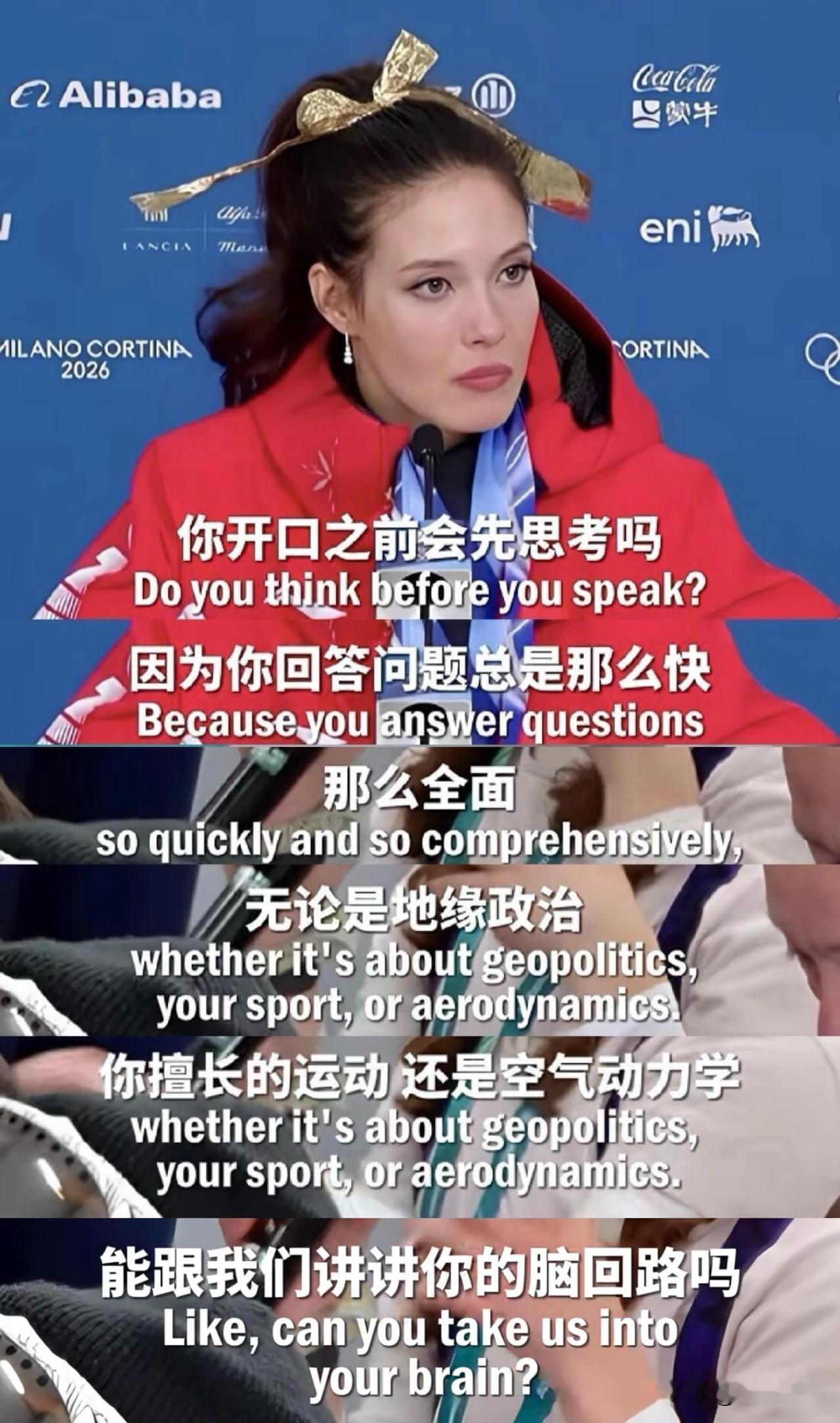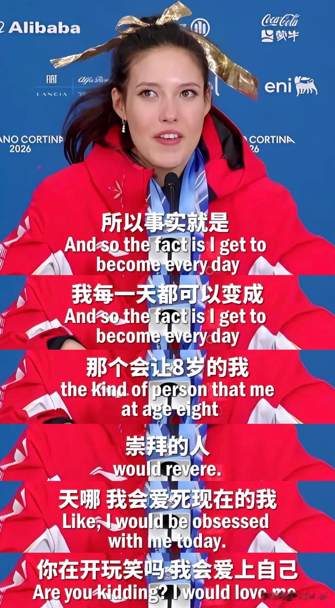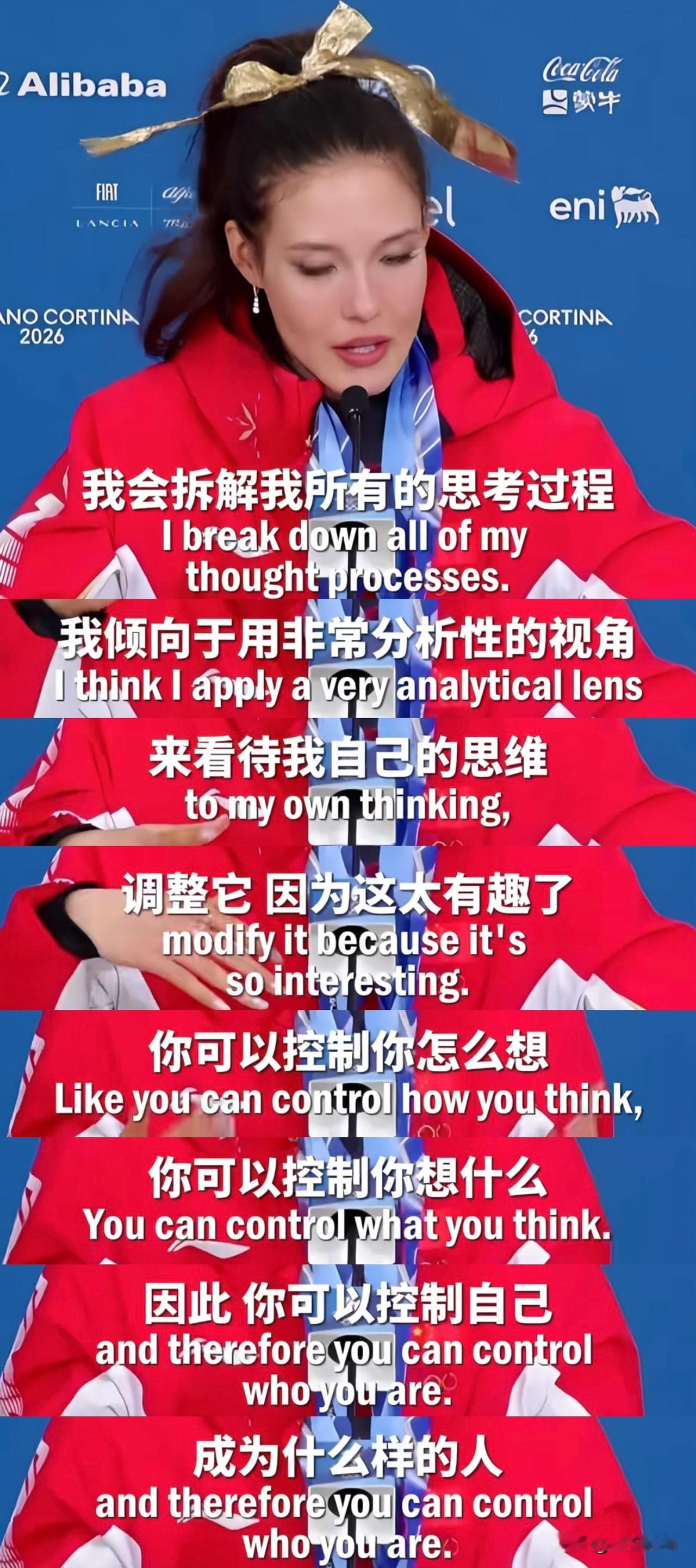看完谷爱凌这段采访,真的太震撼了! 她真的像科幻片里进化到新程度的人类, 身体和大脑都开发到极致, 还会有意识训练开发,且乐在其中。 记者问她为何反应又快又稳。 她说自己爱沉思、爱内省。 会拆解每一个思考过程,用理性去调整。 控制自己想什么、怎么想, 就能掌控自己成为什么样的人。 对了,她4岁开始每天写日记[笑哭] 22岁就懂神经可塑性的力量。 坚信自己能活成想要的样子。 更想成为8岁时自己崇拜的那个人。 对比她我简直像只猴子,算了不内耗了, 今天游完泳一边淋浴一边吃香蕉, 做只热带雨林的快乐吗喽就好~