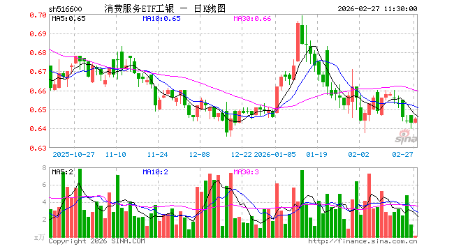 2月27日,截止午间收盘,消费服务ETF工银(516600)涨0.31%,报0.645元,成交额8.88万元。消费服务ETF工银(516600)重仓股方面,贵州茅台截止午盘跌0.42%,恒瑞医药涨0.00%,寒武纪涨1.17%,药明康德涨0.43%,中国平安跌0.54%,五粮液涨0.36%,伊利股份涨0.38%,招商银行涨0.18%,科大讯飞涨0.41%,中国电信涨1.06%。