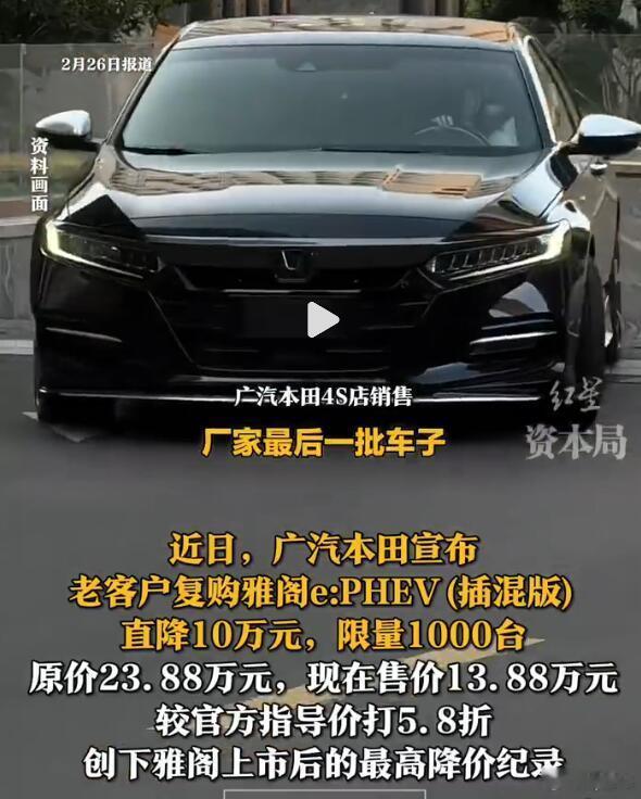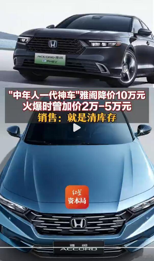 其实就是价格定的太高了,销量不好,所以不得不降价清库存。原价23.88万元,降价10万元之后13.88万元,总算是有性价比了,但是这价格能买的国产新势力也不少,为啥非得买插混雅阁呢?我觉得,真的有可能是老雅阁的车主去复购,或者坚定的日系JDM爱好者,不过都是有点岁数的人了,比如说我就是从第七代开始认识雅阁的,开过坐过,感觉还挺好的,那时候确实国产车没有拿得出手的。但现在,你让00后去买一台雅阁,我怎么都感觉说服不了他们…..中年人一代神车雅阁降价10万元销售回应雅阁降价雅阁插混版直降10万本田雅阁
