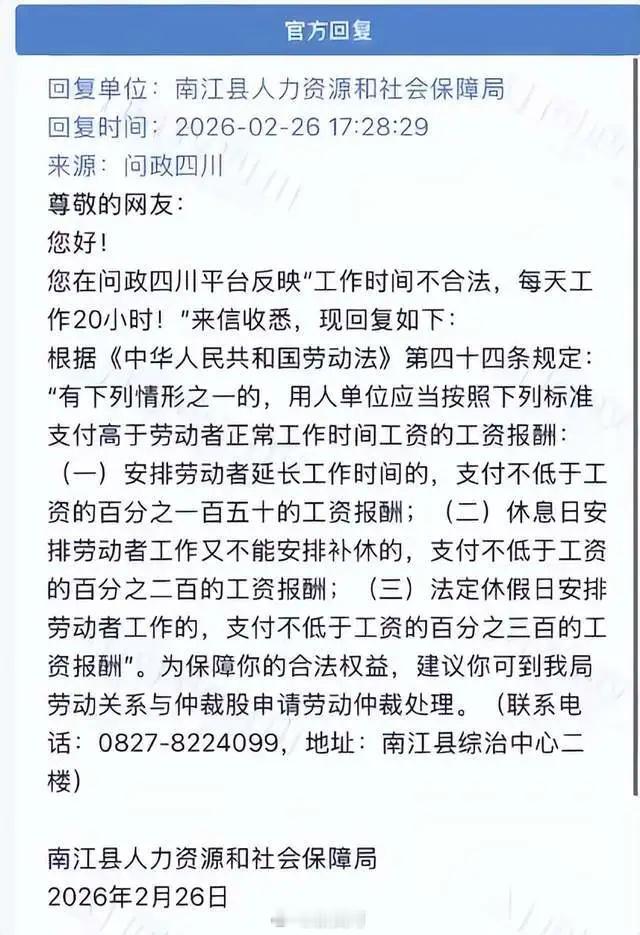 网友投诉信息显示,南江县东榆工业园区华力净洗涤公司工作,每天早上七点工作到晚上凌晨两点,每天工作19小时,月薪3000元,没有社保,也没有任何加班补贴,有很多员工身体都受不了。老板称不能离职,若离职就要扣一个月的工资,并且2026年1月份的工资至今未发放,老板称旺季过完才发放,因为害怕员工离职。
