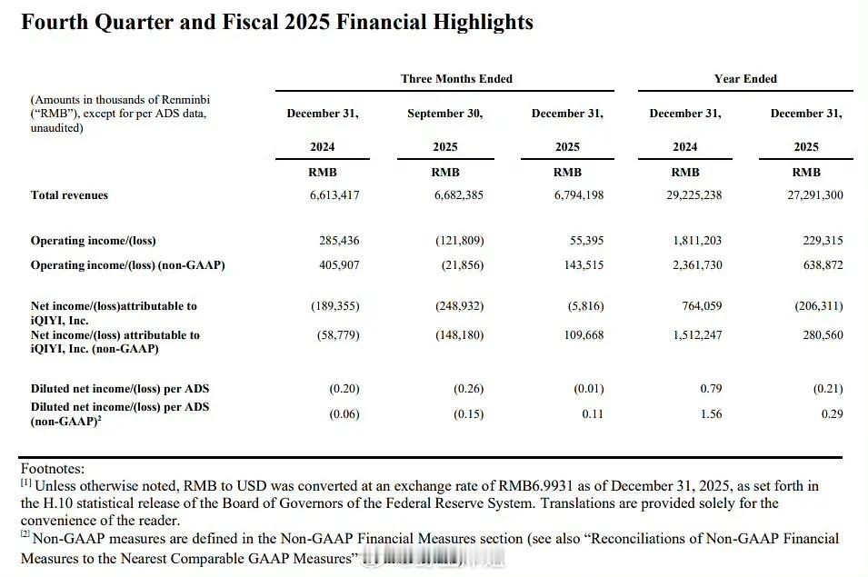 爱奇艺发布25年全年财报 亏损太合理了 扑个不停