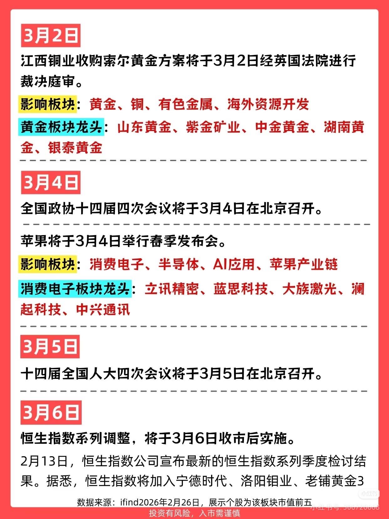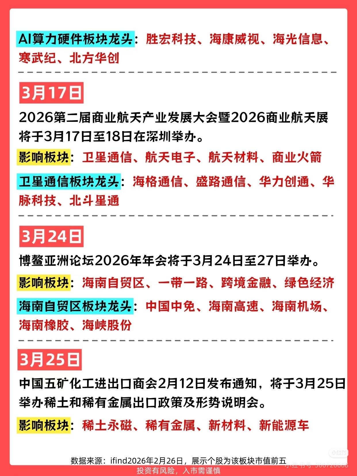 3月A股大事件日历+核心龙头股一网打尽! 2026年3月科技板块呈现“涨价筑底、盛会引爆、政策加持”三大特征。值得关注的科技事件有苹果春季发布会、英伟达GTC大会、上海半导体展、全球开发者大会及商业航天大会等等,叠加两会政策预期,国产替代、AI应用与高端制造将成为贯穿全月的核心方向。 1. 月初看涨价:PCB材料、功率半导体、云计算服务集体提价,夯实科技板块业绩基础; 2. 月中看盛会:英伟达GTC、苹果发布会两大全球科技盛会,是AI算力与消费电子的核心爆发点; 3. 月末看产业:半导体展、开发者大会、商业航天大会密集落地,聚焦国产替代与技术落地,叠加两会政策红利,科技主线将贯穿全月。 ⚠️ 风险提示:科技板块受海外政策、行业竞争、技术迭代风险影响较大,以上内容仅为事件梳理,不构成投资建议。