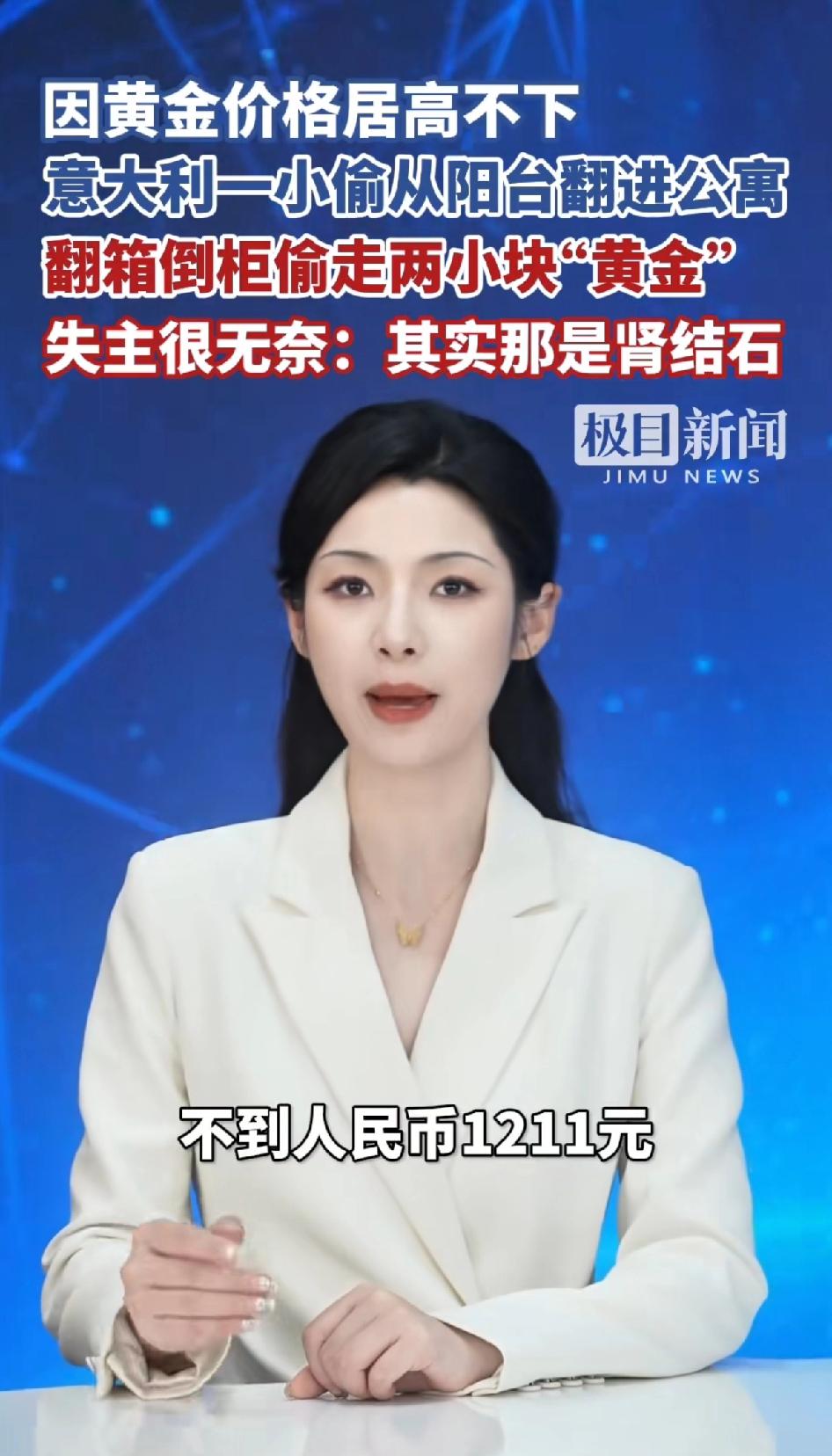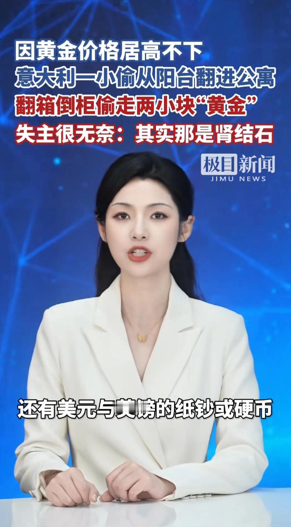 因黄金价格居高不下,意大利一小偷从阳台翻进公寓,翻箱倒柜的偷走两小块用盒子装着的“黄金”。可失主很无奈,那不是黄金,其实那是肾结石! 《威尼托信使报》前副主编家就遭了这档子事。除了“黄金”,小偷还顺走了以前旅游剩下的美元、英镑纸钞和硬币,换算下来不到1211元人民币。 失主应该也很无语,别人丢金丢银,他却丢了肾结石!真是人生中的一大趣事。 这小偷怕是满心欢喜以为发了财,结果到手的是这玩意儿,好奇肾结石要黄成什么色?一定很重,才会被当成黄金! 更好奇小偷真是有个贼胆子,长了个蠢脑子,眼神还不行,肾结石当成“黄金”也是够滑稽的。他看到这个新闻会不会被同行嘲笑[呲牙]想想都觉得搞笑。
