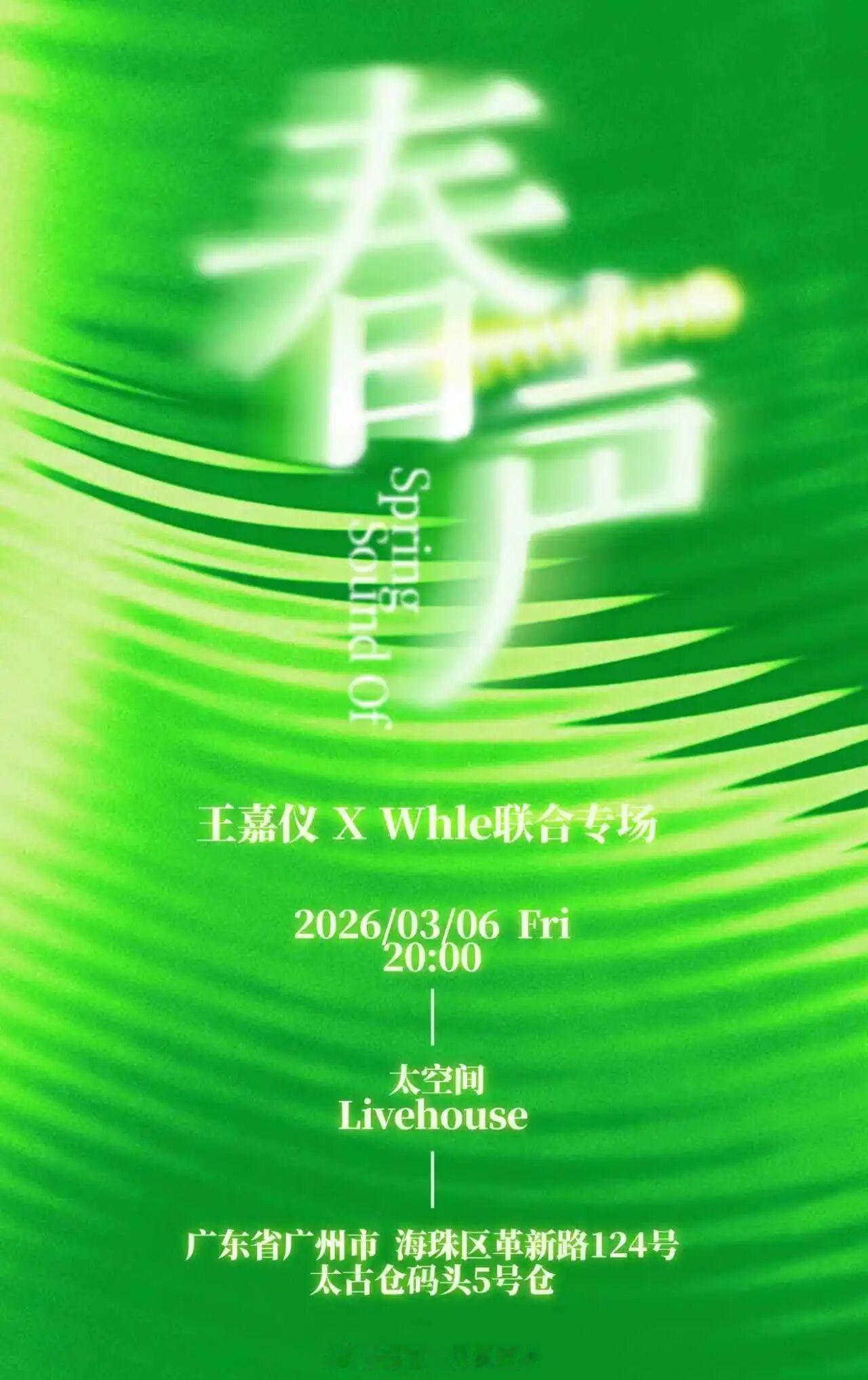 「春声」王嘉仪 & Whle 特别专场🕗 2026.3.6(周五)20:00📍 广州 太空间livehouse🎫 预售 158 / VIP 198(含签售)⏰ 2 月 28 日 11:00 开票