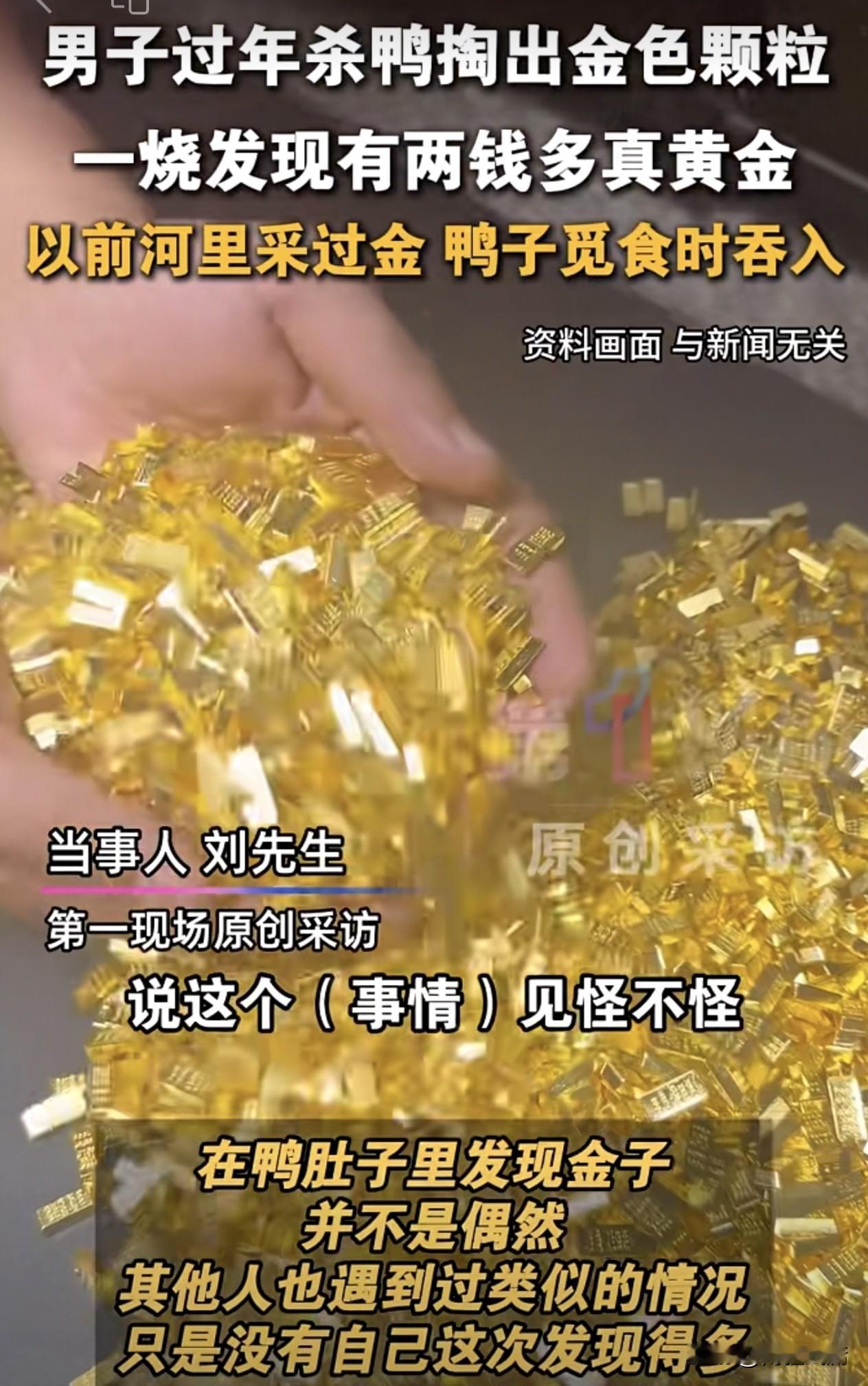 杀鸭杀出黄金!湖南一男子宰自家鸭子,竟在鸭肚里掏出真金粒,唐朝早有记载 你敢信吗?宰一只自家养的土鸭子,还能额外“赚”到黄金! 2026年2月26日,湖南邵阳的刘先生就碰上了这桩会让你感觉离奇又幸运的事。 当天,刘先生像往常一样处理自家散养的鸭子,本来只是准备做顿家常菜,可在清理鸭内脏、剪开鸭胃的时候,意外掉出了好几颗金灿灿的小颗粒。一开始他还以为是小石子或者塑料片,可拿在手里沉甸甸的,颜色也格外亮眼。 抱着好奇的心态,刘先生用火烧的方式简单测试,结果这些小金粒不仅没有变黑变色,反而光泽更明显,正是老话里说的“真金不怕火炼”。之后他找专业人士鉴定,确认这些颗粒都是货真价实的黄金。 刘先生也分析出了原因:他家的鸭子一直是河边散养,自由觅食,而附近的河道以前有过金矿开采,河床里本就残留着细碎的沙金。鸭子在觅食时,会误食砂石帮助消化,顺带就把金粒吞进了肚子,黄金无法被消化,就这样留在了鸭体内。 他还提到,这种事其实不算完全罕见,周边之前也有人遇到过,只是自己这次发现的数量算比较多的。 更有意思的是,这种“鸭鹅产金”的怪事,并不是现代才有的新鲜事。我国唐代古籍《岭表录异》中就有明确记载:古时候岭南地区的农户,会专门饲养鸭鹅,然后淘洗鸭鹅的粪便,从中收集细小的“麸金”,堪称古代版的“生物淘金”。 老话常说,无心插柳柳成荫,刘先生杀鸭得金的奇遇,正是生活里最意外的惊喜。这也印证了,世间不少看似离奇的新鲜事,其实早有历史可循,平凡的生活里,永远藏着意想不到的小幸运。
