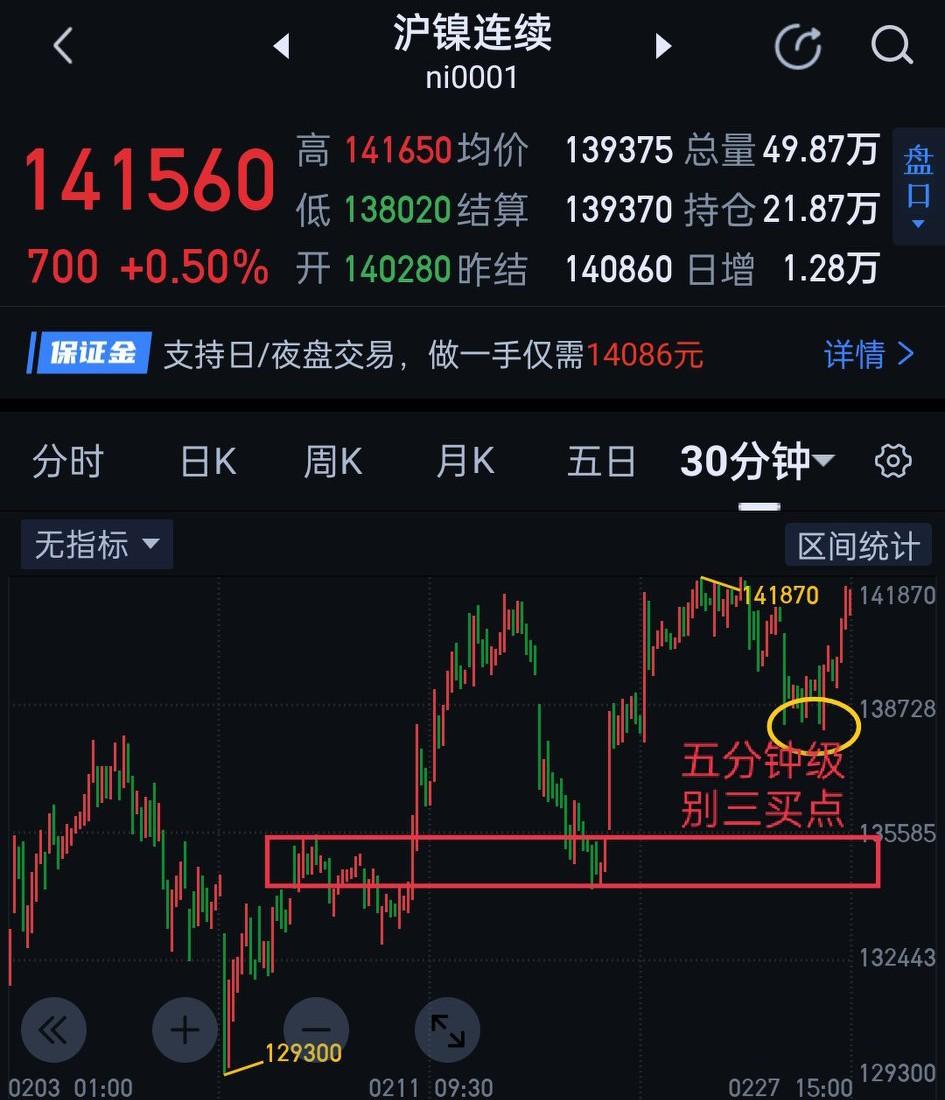 沪镍,今天的变盘如期而至。沪镍早盘完成了图〈1〉一分钟级别的趋势背驰,随之迎来了快速的反弹,目前从138020开始的三十分钟一笔上的结构也呼之欲出。夜盘,只要能有效站稳139070,还可以继续用三十分钟一笔上的视角去跟随上涨。细节上,夜盘如图〈2〉所示,140560能否有效站稳是关键。站稳,可用移动止盈,继续跟随从139070开始的五分钟一笔上的生长。如不能站稳140560,则要观察新的五分钟一笔下是否能在139070上方站稳。站稳,沪镍将有望形成五分钟级别的上涨趋势,继而挑战阶段性高点152300。