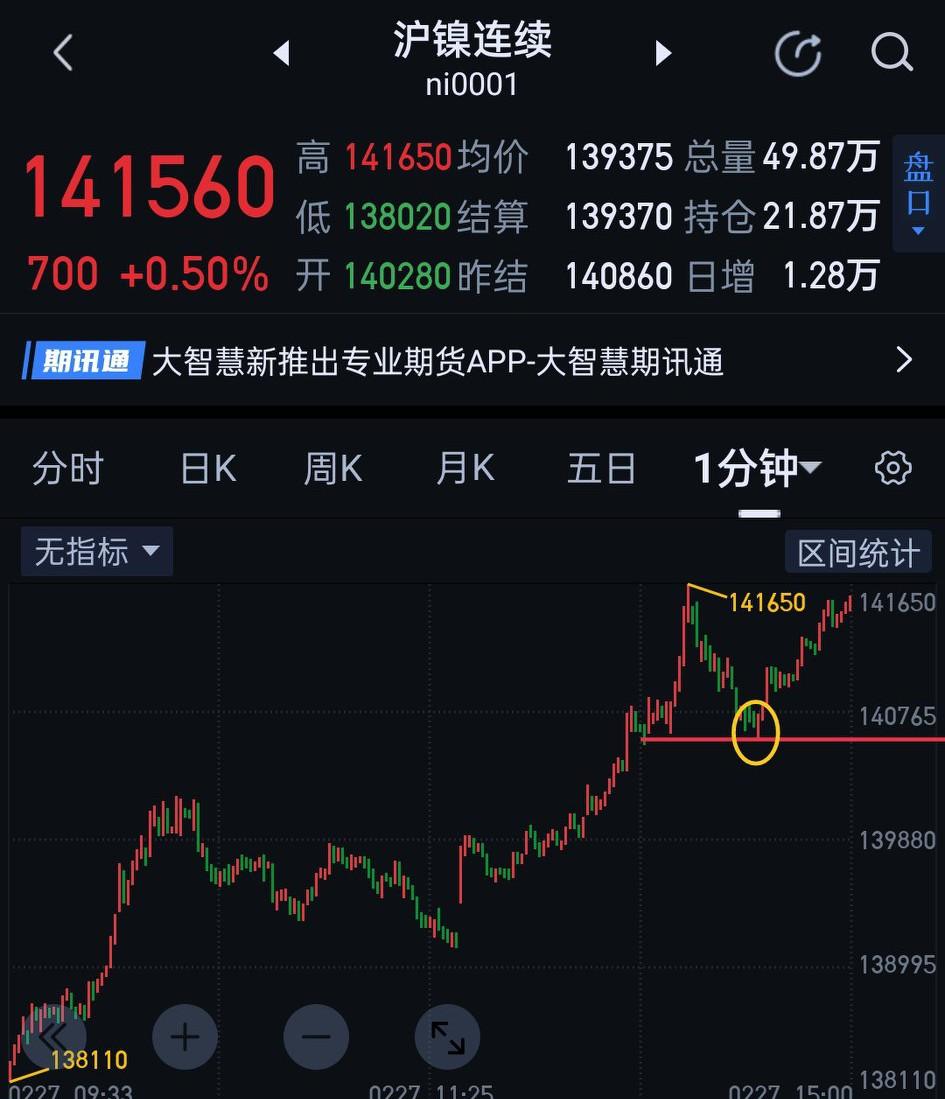 沪镍,今天的变盘如期而至。沪镍早盘完成了图〈1〉一分钟级别的趋势背驰,随之迎来了