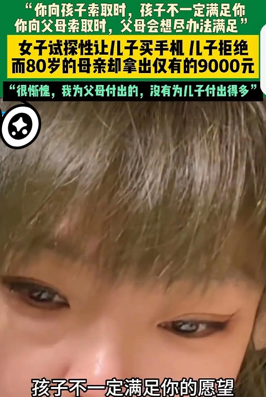 2月25日,吉林。女子的儿子向她转来1.8万块钱,让她帮存起来。女子忽然想试试儿子,看他能不能满足自己的愿望。对儿子说,我的苹果11手机是你用剩下的,你能帮我换个苹果17手机吗?儿子头摇得像拨浪鼓似的说,我的钱好不容易才攒下的。 女子回到80岁母亲的家,问母亲要1万块钱。母亲有些遗憾的说,我只有9千块钱。说着就从抽屉里拿钱。 女子表示,她为父母付出的,没有为儿子付出的多。她认为父母会尽力满足子女的愿望,孩子不一定满足父母的愿望。 女子的观点有一定的道理,父母出于对子女的爱,会尽力帮助子女。 女子的观点也不完全对,她的儿子做的已经相当不错了。起码不像有的年轻人是月光族,向父母伸手要钱。年轻人在社交方面,花费很大。而他还有节余,并让妈妈帮存起来,表现相当不错。女子的手机还可以用,又要换昂贵的手机,可以说是奢侈。做父母的也常常教育孩子不要浪费,这不能怪孩子不帮买。 女子的母亲舍得给,是因为花钱的地方不多,再一方面相信女子不会乱花钱,所以给得很痛快。好果知道是乱花钱,肯定要教训一顿。 女子用买手机来试探亲情其实是走进了误区。这种无条件要满足自己的愿望不可取。母亲只有9000块钱,不能满足女子的愿望,儿子虽然可以满足她,但是儿子要紧缩其他方面的开支。如果女子再提几个愿望,儿子肯定承受不住。 亲情不能用满足愿望来要求,这样会走入死胡同。亲情最重要的是和睦相处。 女子试探让儿子帮买手机被拒亲情