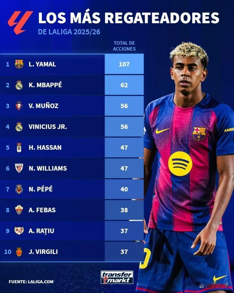 Promax版梅西,亚马尔本赛季在西甲107次过人遥遥领先! 懂球的都知道,梅西的盘带技术是足坛顶级,在球场上没有梅西过不去的球员,但是和亚马尔比起来,梅西的盘带技术只能说是mini版亚马尔了,而亚马尔则是Promax版梅西。 本赛季在西甲联赛,亚马尔已经完成了107次过人,而排名第二的姆巴佩只有62次过人,亚马尔基本上要领先姆巴佩2倍了,不得不说亚马尔的过人天赋真的是太强了。 本以为梅西的过人技术很强了,但是和亚马尔比起来还是差太多了,亚马尔是身体素质和天赋都比梅西强太多了,未来亚马尔的下限至少是梅西,上限也许可能达到C罗的高度。