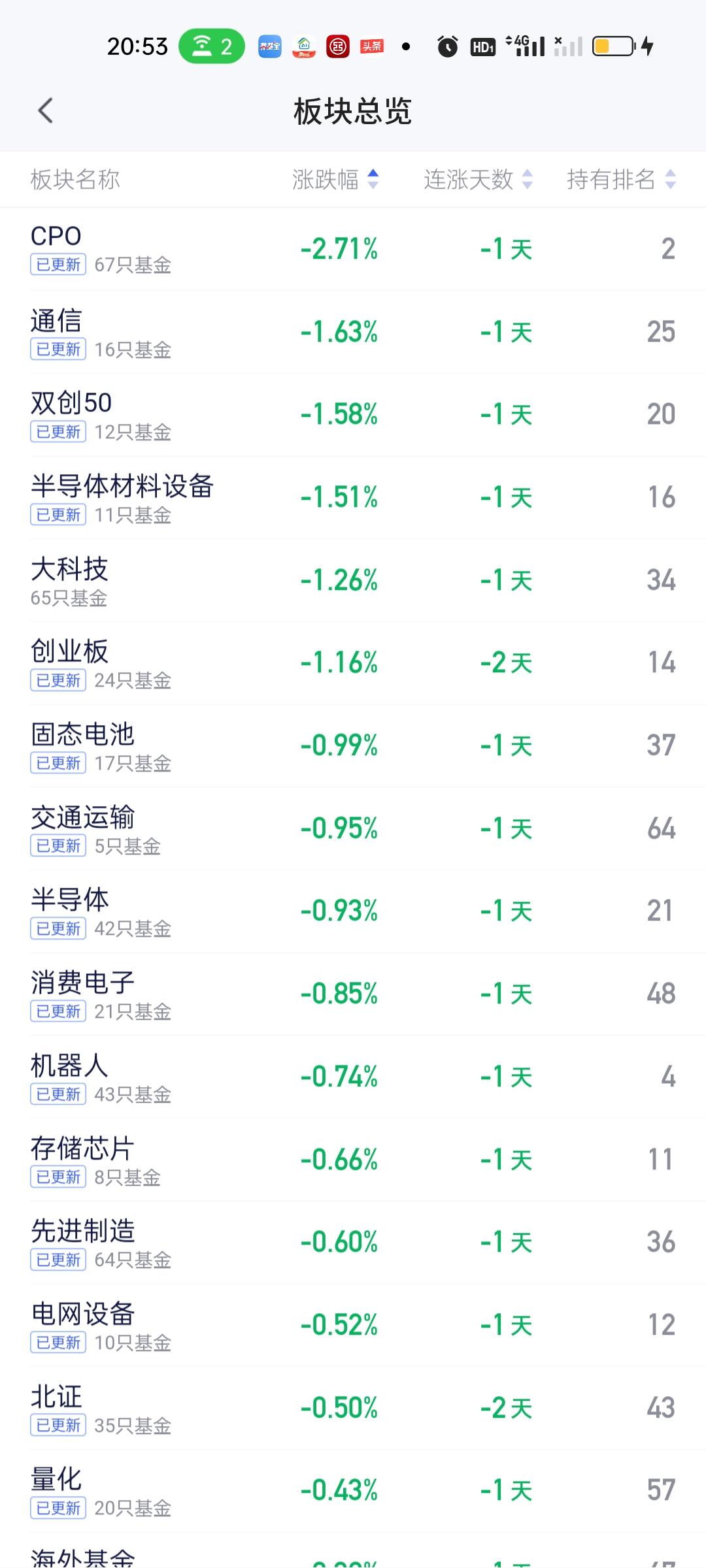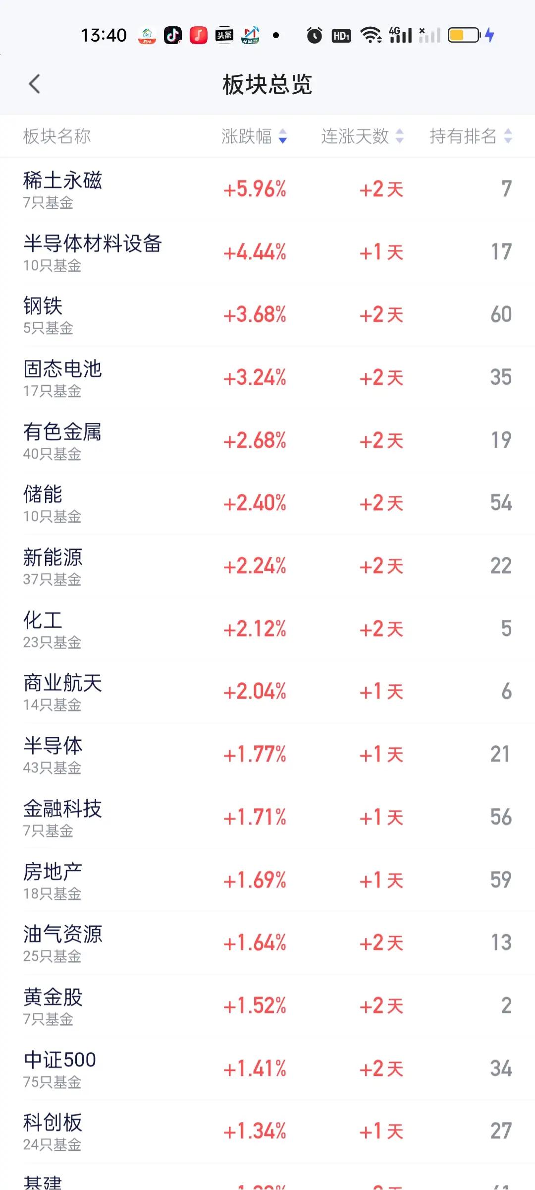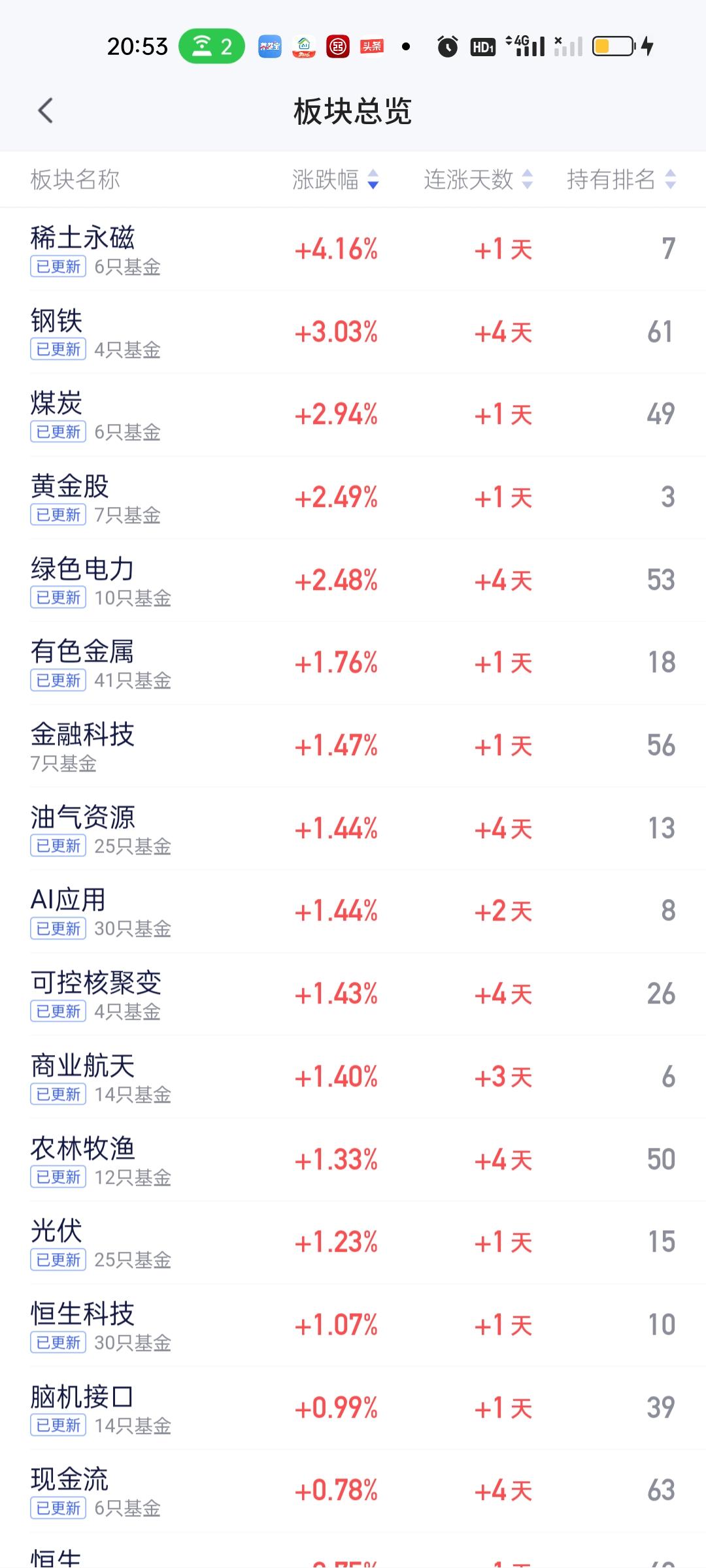 如果记得不错前天涨得最好的板块就是稀土永磁。当日涨幅接近6%,今天它的涨幅依旧最大,涨幅在4.10%以上,另外钢铁和煤炭涨幅也在3%左右,资源股这段时间隔三差五就会来上一波,资源股的强势崛起要引起重视,行情很有可能还没结束! 跌幅方面,CPO,通信,双创50,半导体材料和设备,大科技,创业板,交通运输,固态电池,半导体,消费电子,机器人,存储芯片跌幅靠前。