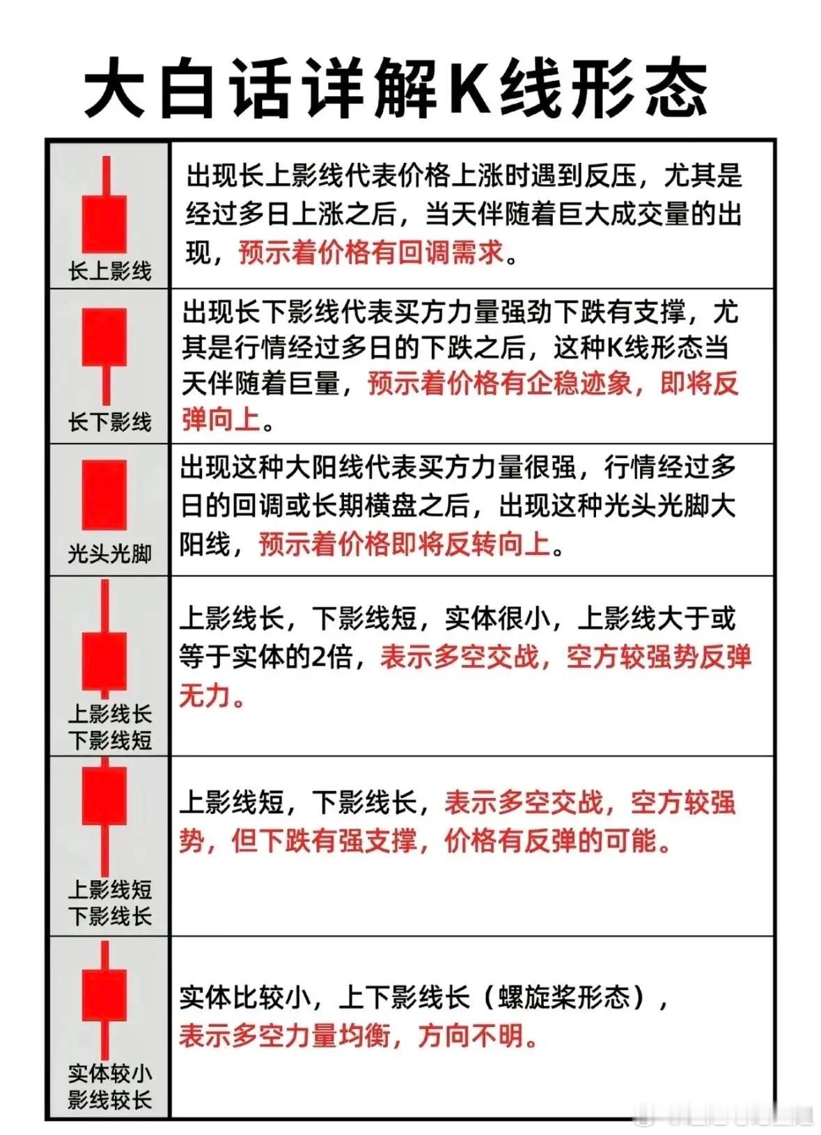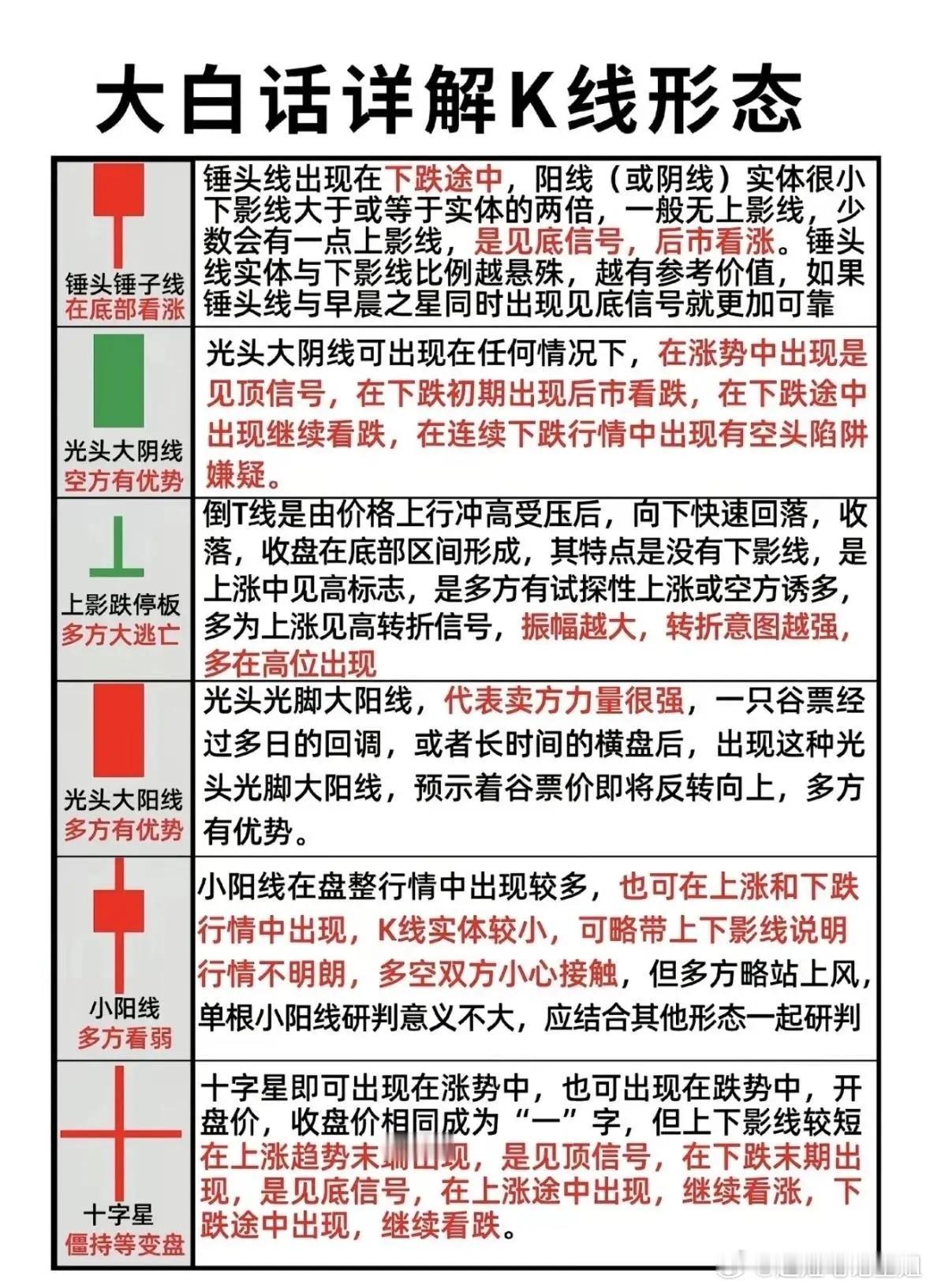 K线形态这玩意儿,对股民来说太重要了,没看懂K线,就会吃过大亏。K线形态有很多种,像常见的十字星,它表示多空双方力量达到平衡,市场可能要变盘。还有大阳线,一般意味着多方强势,股价可能要涨。大阳线出现的位置很关键,如果在高位出现,可能是主力出货的信号。所以,看懂K线形态不能只看表面,得结合成交量、市场环境等因素。有了这张全解析图,能让咱们更轻松地把握K线,少走弯路,多赚钱!