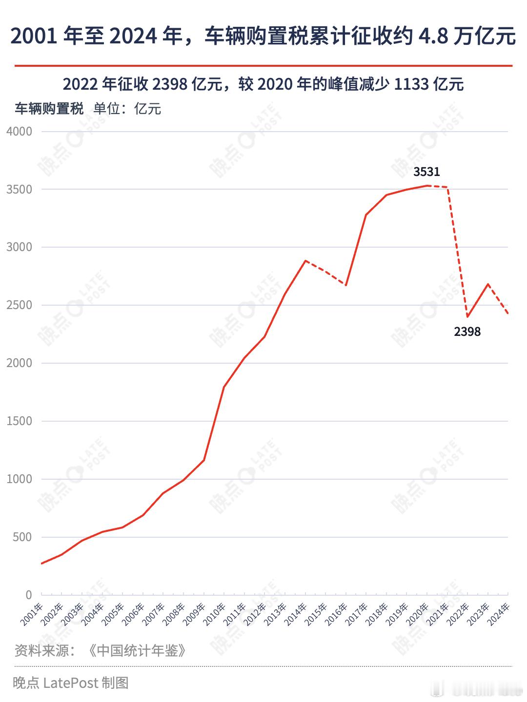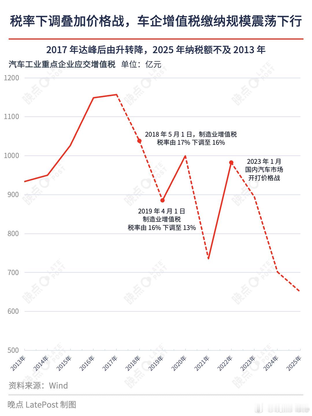 近些年,制造业增值税两次下调加上汽车价格战,以及留抵退税政策落地,汽车行业增值税缴纳规模震荡下行。新能源车的销量爆发也导致 2022 年的汽车购置税征收额较 2020 年的高点下降超 1000 亿元。