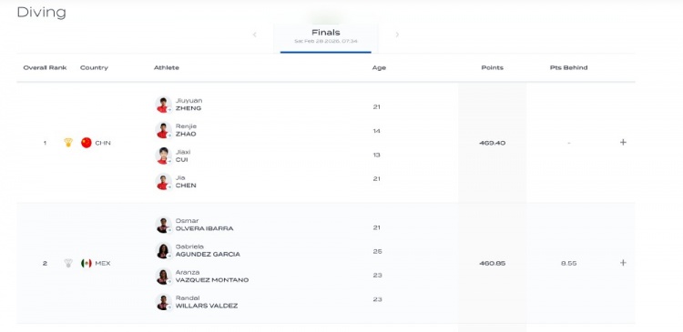 由郑九源、赵仁杰、崔家溪和陈佳组成的中国队,凭借小将崔家溪/赵仁杰最后一轮的出色表现,以469.40分逆转墨西哥夺得金牌,墨西哥队获得亚军。
