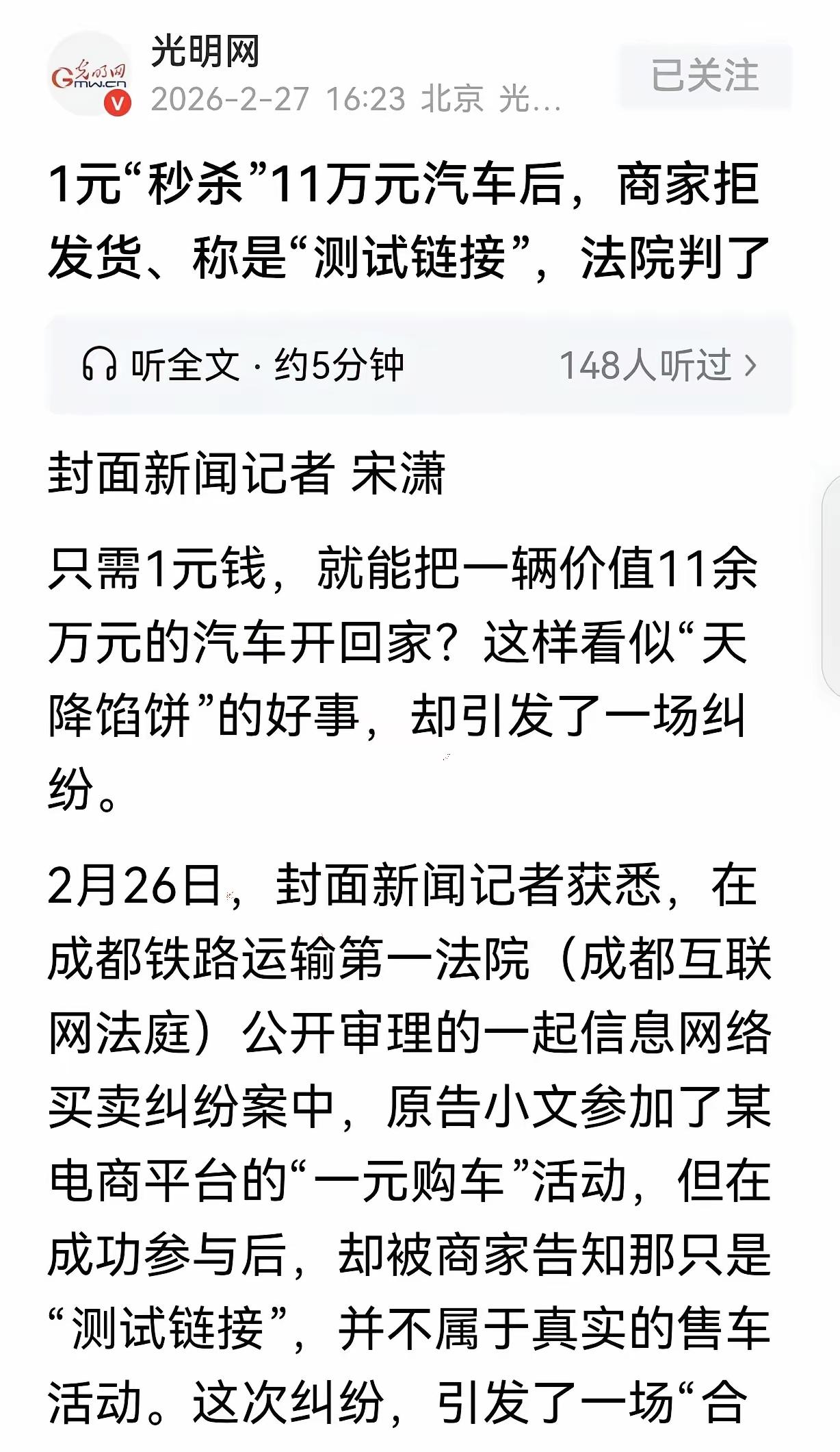 玩不起!”四川成都,一男子看某汽车官方店铺有“一元购车”活动,只花1块钱,就能买下118900元的汽车,可把他乐坏了,赶紧下了单,万万没想到,店家说男子下单的只是“测试链接”,不属于真实的卖车活动,拒绝发货,让男子赶紧退款,男子空欢喜一场,一纸诉状,把店家和平台告上法庭。要求要么兑现汽车,要么给118900元。法院判决出乎意料。 结果直接败诉,诉求全被驳回。很多人觉得商家失误就该担责,凭啥让消费者白忙活,可法院的判决其实戳中了网购合同的核心——真实意思表示。这个链接满是漏洞,品牌对不上、配置写错,价格更是离谱到不符合常理,根本不算有效要约。 我觉得网购捡漏得留个心眼,明显违背市场规律的便宜,多半是坑;商家也别拿失误当借口,上架前严格审核,才是对消费者最基本的尊重,别让测试链接伤了大家的信任。