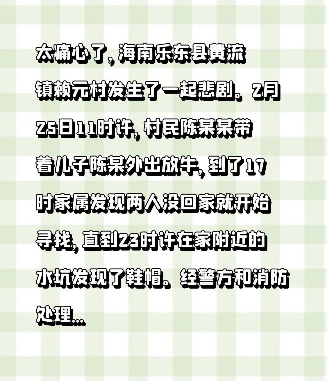 太痛心了,海南乐东县黄流镇赖元村发生了一起悲剧。2月25日11时许,村民陈某某带着儿子陈某外出放牛,到了17时家属发现两人没回家就开始寻找,直到23时许在家附近的水坑发现了鞋帽。经警方和消防处理,将两人打捞上岸,确认已无生命体征。 原来,事发水坑是同村村民2月中旬在承包地内挖的。有网民称是田主私自开挖农田采砂。镇政府初查是儿子先不慎坠坑,母亲去救也不幸遇难乐东灾情