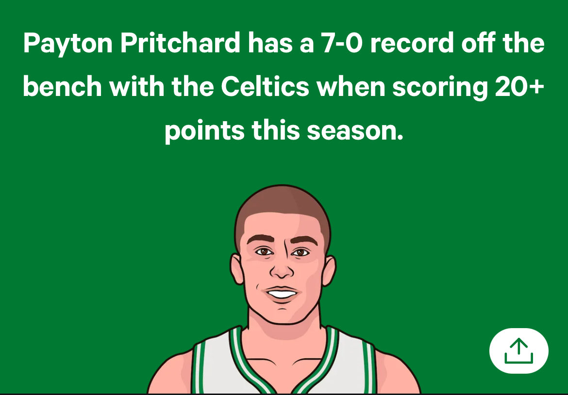 借此,本赛季当佩顿-普里查德替补出战砍下20+时,凯尔特人的战绩为7胜0负。