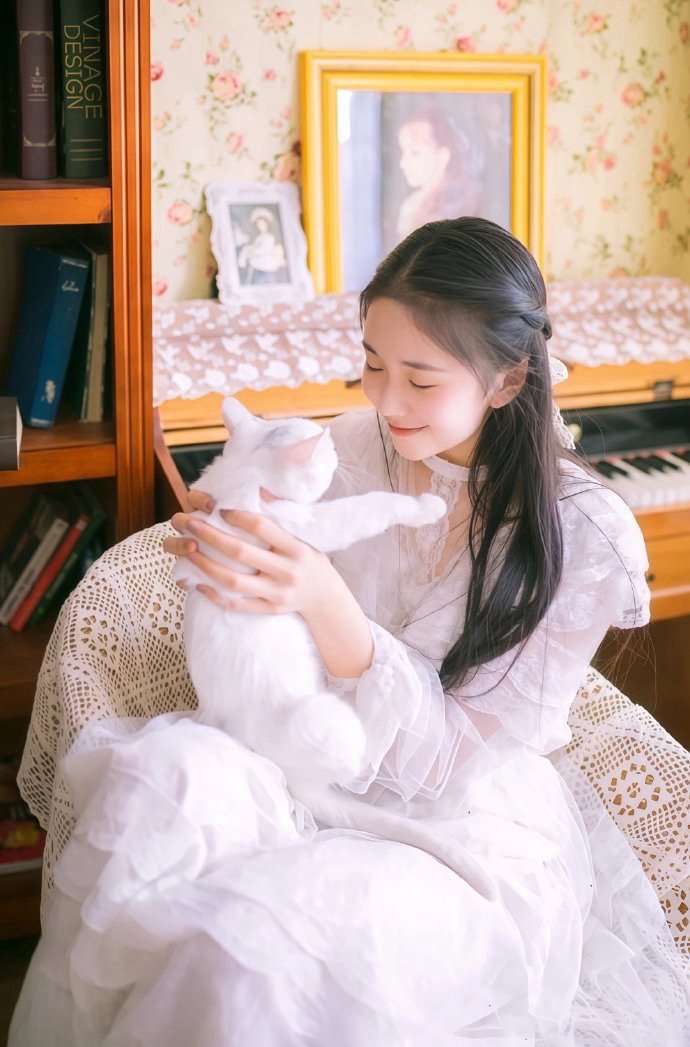 刘浩存 白纱轻裹,指尖抚过猫咪软绒的毛,笑意漫过碎花墙纸,连时光都在这一刻变得温柔又治愈。