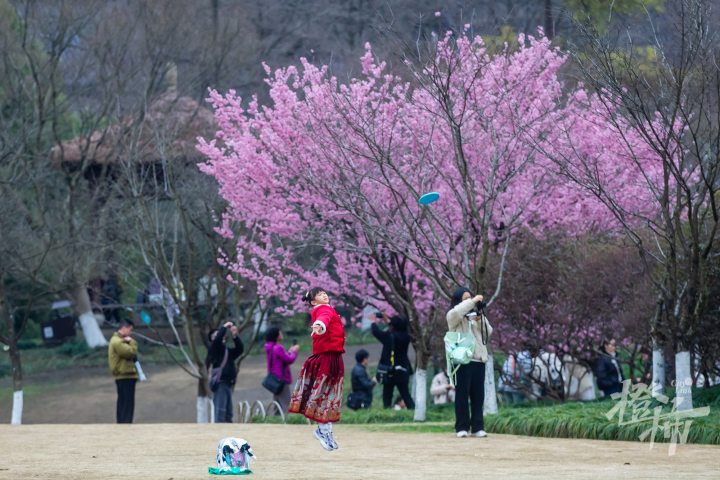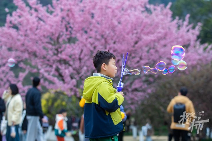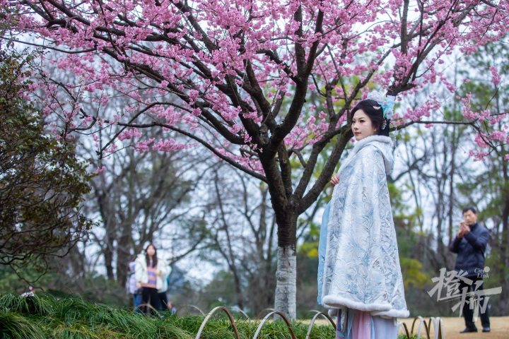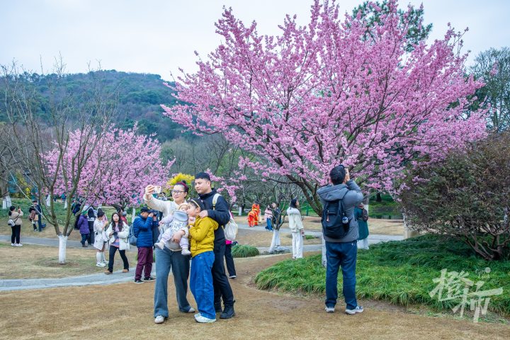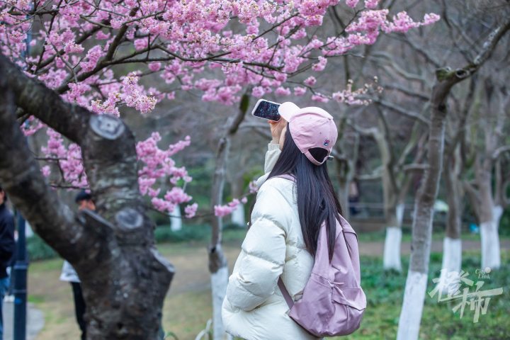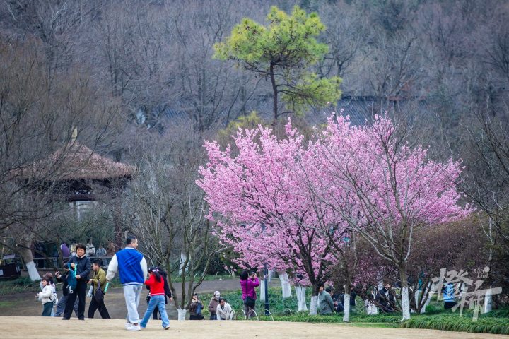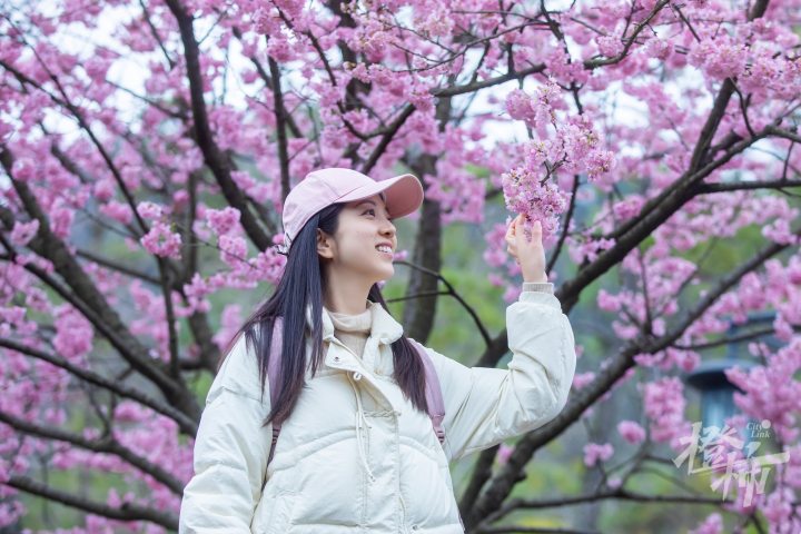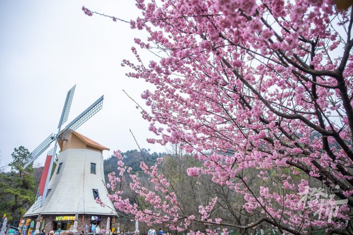 在太子湾公园望山坪草坪标志性的大风车旁,有两棵樱花树早早盛开,这个品种叫椿寒樱,目前这两棵樱花树的开花率已经达到90%左右,进入了最佳观赏期。