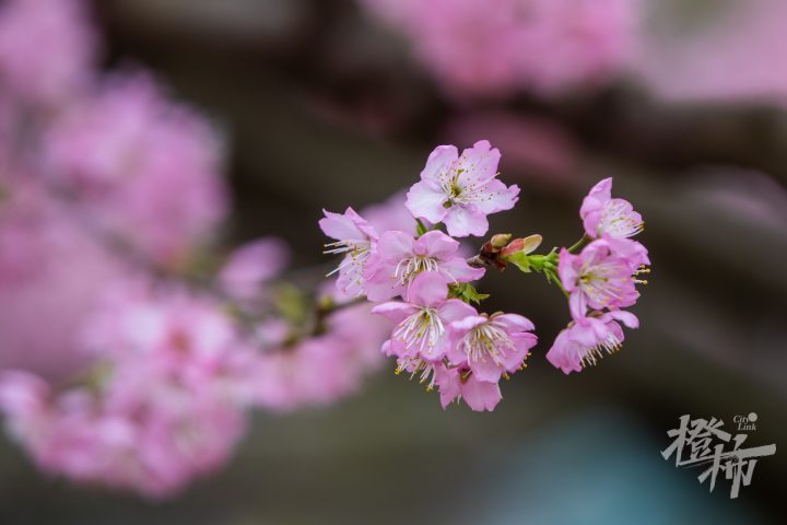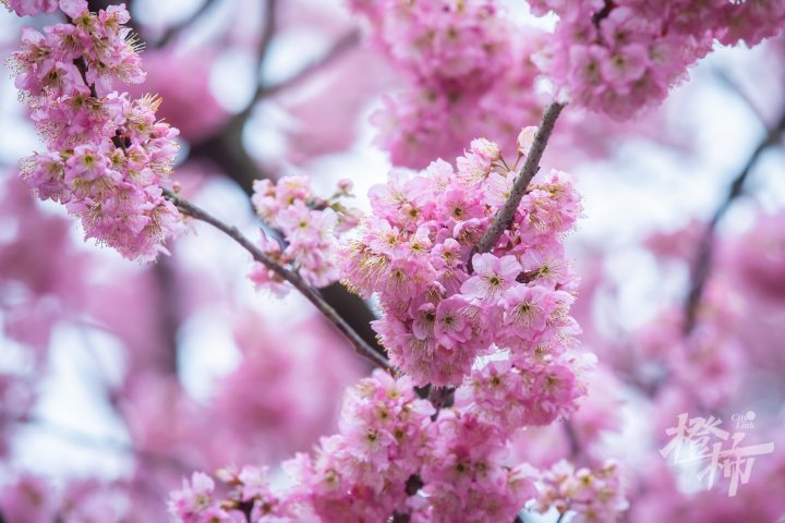 椿寒樱是樱桃与钟花樱的杂交后代,所以花朵不仅繁密,还带有一种淡淡的樱桃花香味。盛开时,花量饱满层层叠叠,开成了一片粉色云霞。