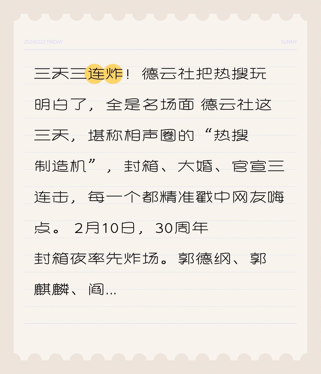 三天三连炸!德云社把热搜玩明白了,全是名场面 德云社这三天,堪称相声圈的“热搜制造机”,封箱、大婚、官宣三连击,每一个都精准戳中网友嗨点。 2月10日,30周年封箱夜率先炸场。郭德纲、郭麒麟、阎鹤祥的群口《单身保卫战》,把催婚梗玩出了新高度。老郭掏照片连环“逼婚”,大林一句“爸爸您还是不够努力”,直接让爸爸还是您不争气啊话题两小时破亿。更重磅的是,郭德纲官宣成立德云十队,张九南接过队长牌,社团扩容的消息让粉丝直呼“终于能多抢票了”。 次日热度不减,陶阳大婚把德云红事会馆变成了“相声年会”。郭德纲主婚、于谦证婚,全员齐聚。最妙的是捧花环节,新娘直接把花塞给郭麒麟,大林用天津话调侃“你们这是算计我”,弟弟郭汾阳还上前抢花,现场笑料拉满。前一天封箱催婚,第二天捧花“锁死”,网友戏称“老郭操盘的剧情太上头”。 第三天,曹云金相关话题意外登顶。有人爆料双方团队年前已私密会晤,关系疑似破冰。一边是曹云金在海南卫视春晚高情商化解起哄,一边是郭德纲感慨“江湖路宽”,这波“活久见”让网友吵翻了天,有人盼和解,有人守初心。 三天三场大戏,有师徒传承的温暖,有家族烟火的趣味,也有江湖恩怨的悬念。德云社三十年,靠的从来不是单一噱头,而是台上的真功夫、台下的人情味。这波热搜,实至名归!
