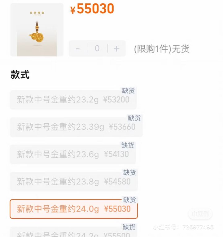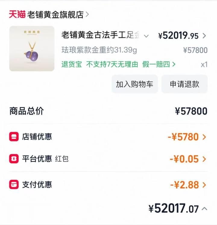 “本来想看一下早上调价幅度,如果幅度不大就退款。”昨晚8点,老铺黄金在调价前最后一天最后一轮线上补货上架,除了个别克价高的点钻类饰品,大部分饰品包括摆件被抢购一空。祝小姐在零点时捡漏了一个紫色珐琅葫芦吊坠,原价57800元,9折后售价52019.95元。