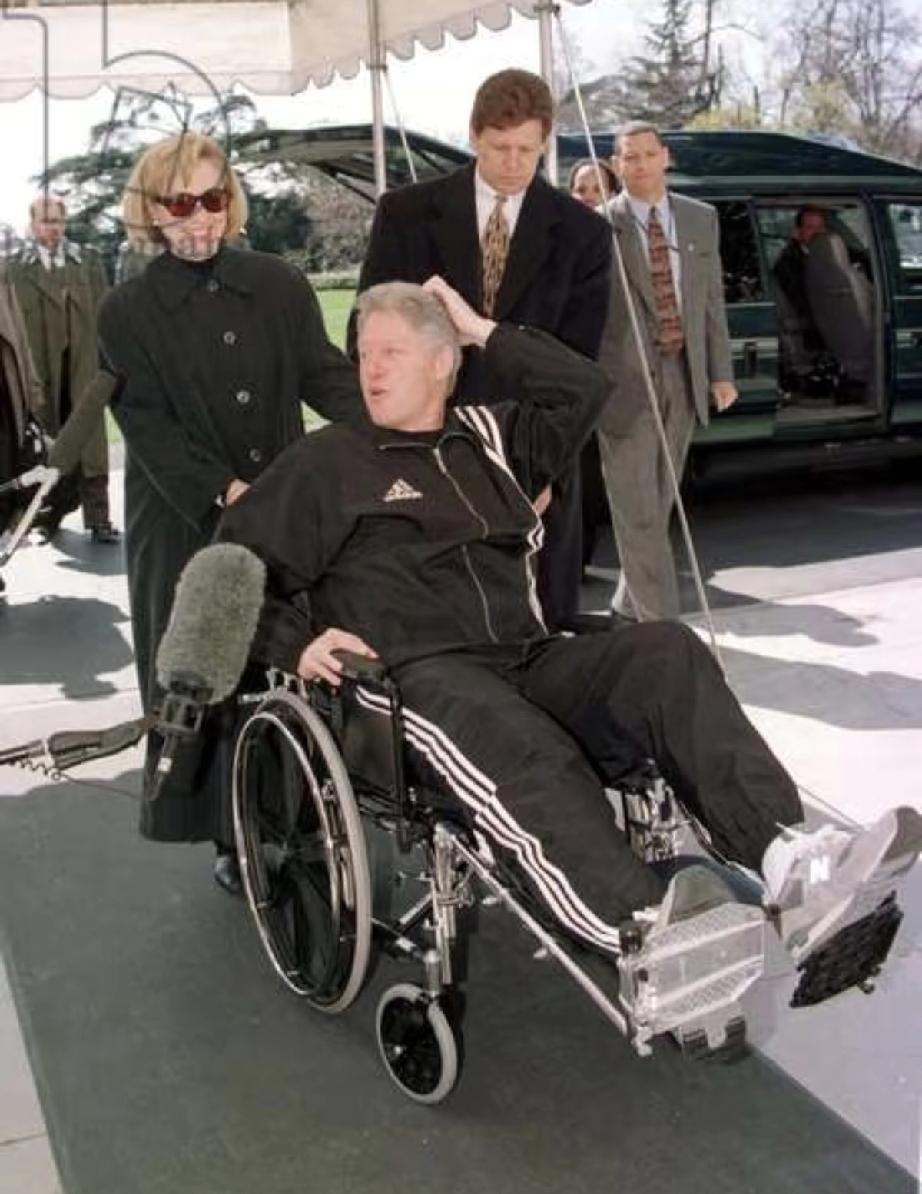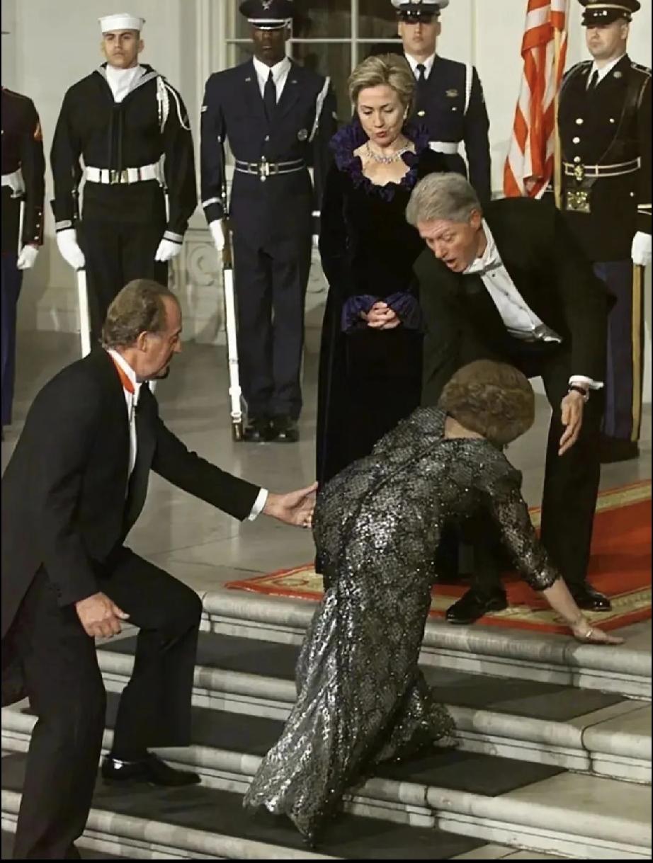 希拉里对克林顿的爱是专一的,执着的。 她宁肯笑着为坐在轮椅上的克林顿当推车夫,也不肯弯下腰来扶一把摔倒的索菲亚王后,当时的表现好像一个冷漠的看客。 克林顿还真是怜香惜玉的。 索菲亚王后的突发状况,让他大惊失色,随之做出躬身九十度的帮扶动作。 场合里应有的绅士风度,克林顿的反应挺及时的。 衬衣系红领结男士的举动有素质。 一边是希拉里的一枝独秀; 一边是希拉里的雌竞现场。