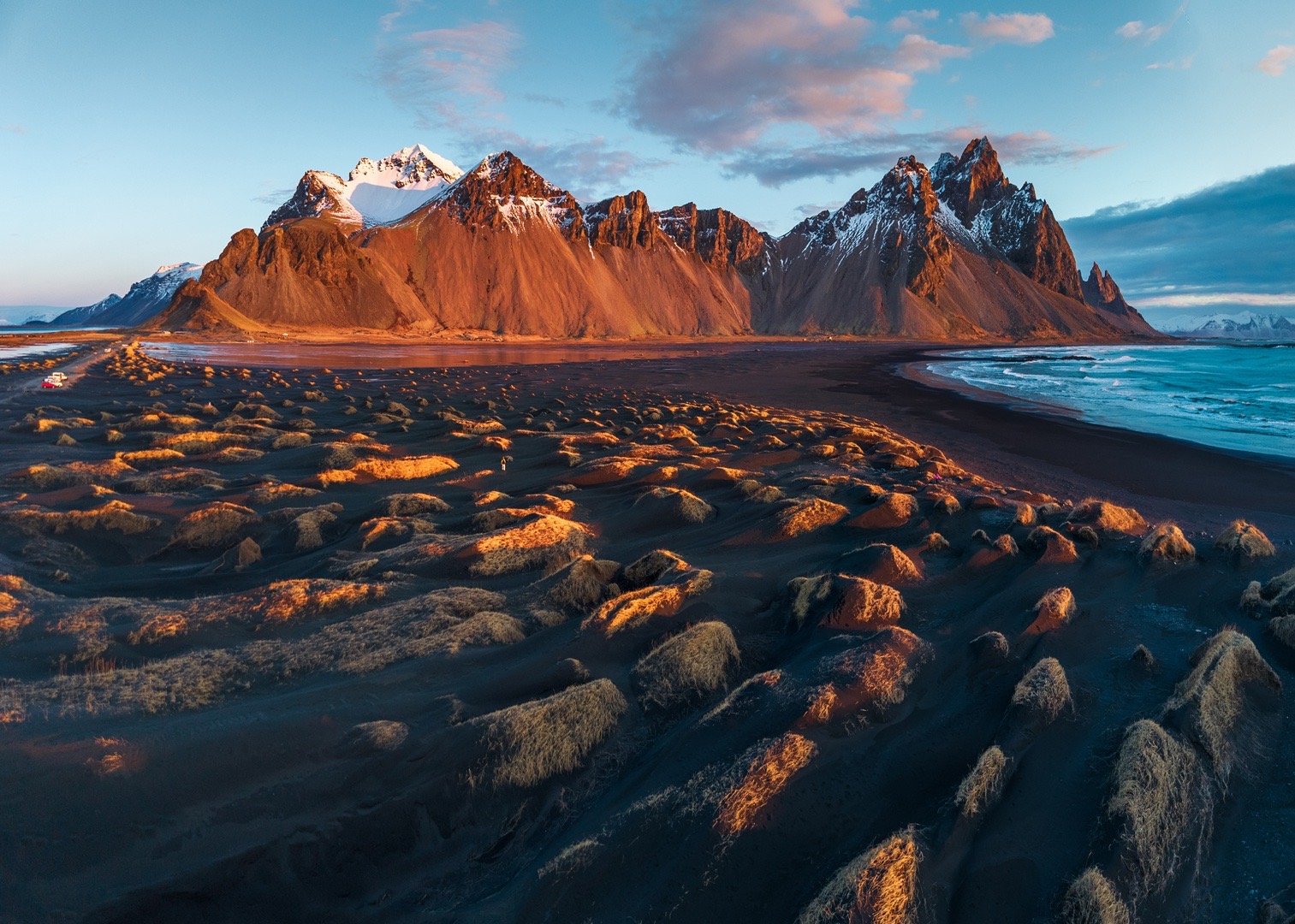 冰岛东部小镇Höfn是我们的福地,蝙蝠山每次都会展现出不同的精彩。从航拍视角灯塔与雷达站的孤独感,到黑沙滩上捕捉那一抹转瞬即逝的金山倒影,不同的光线、潮汐和心境,都能写就全新的视觉篇章。 冰岛