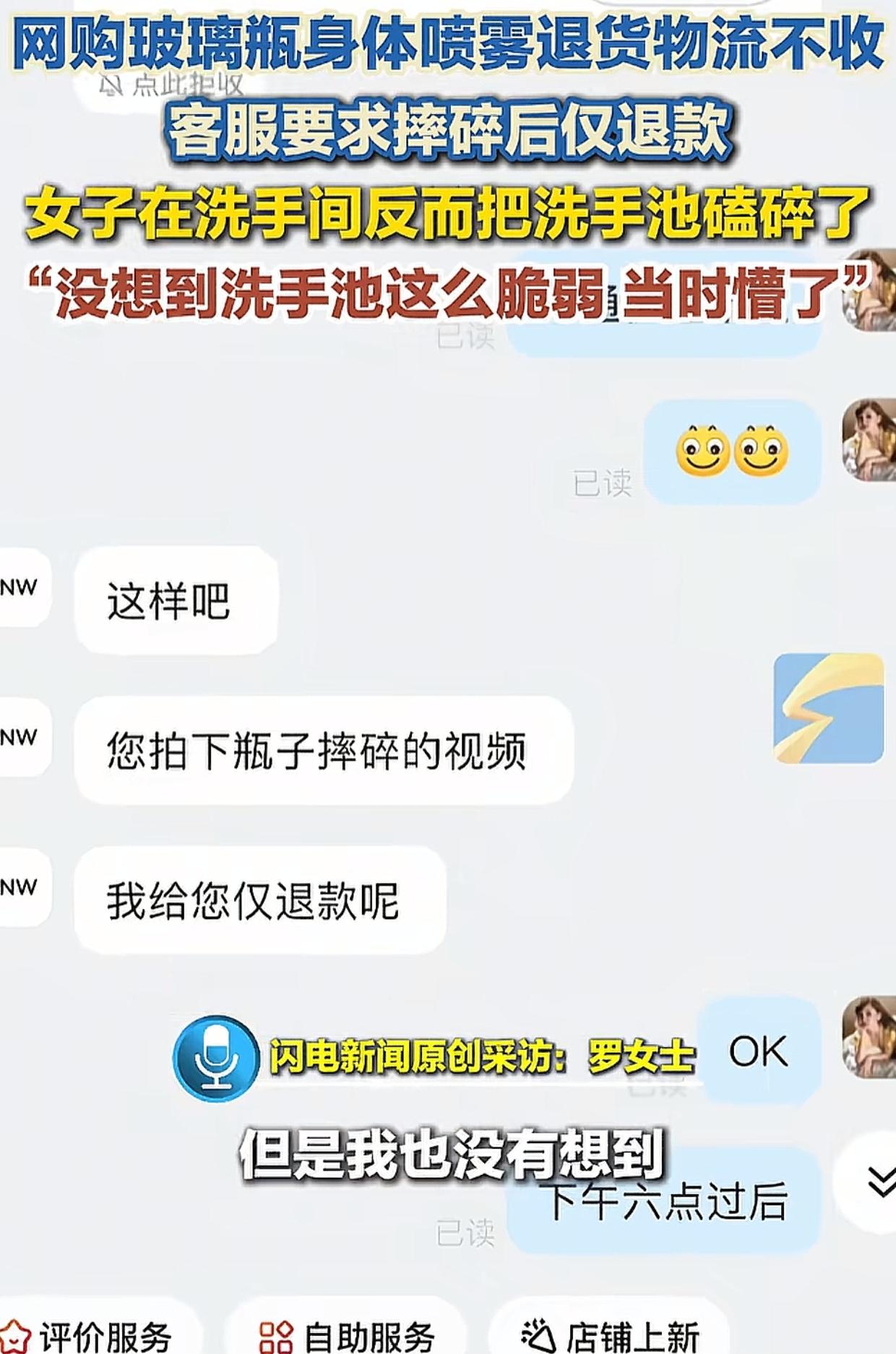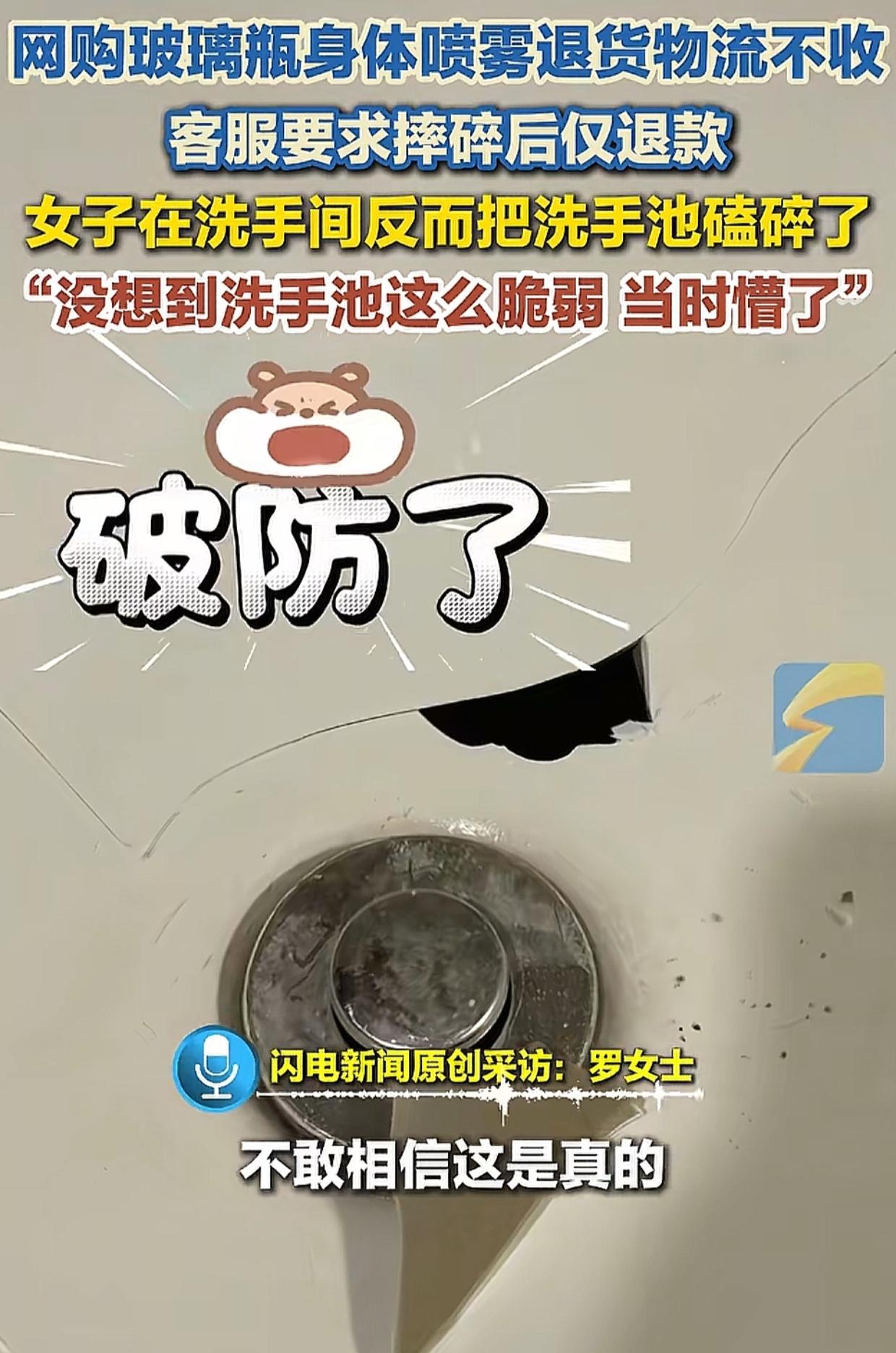 陕西女子网购了一瓶49.9元的身体乳,想要退货,谁知快递不收。客服提议女子将瓶子摔碎,并拍下视频,女子欣然同意。 为了便于清理,女子选择在自家洗手池里摔瓶子,她先是拿着瓶子砸了洗手池一下,谁知没有反应,接下来她用力砸了一下,悲剧发生了,瓶子没事儿,但自家洗手池破了一个洞。 女子没想到洗手池这么脆弱,当时就懵了,随后她把当时拍的视频发给了客服,客服也吓了一跳,二话没说,火速把49.9元退给了女子。 看到视频,网友哭笑不得,有网友说,破防了,为了退回49.9元,损坏了至少值几百元的洗手池! 有网友开玩笑说,咋这么会选地方呢,咋没往洗手间镜子上砸! 不得不说,女子的生活常识确实差了点儿,瓶子是玻璃的,洗手池是陶瓷的,两者的硬度都很高,但瓶子个头小,受力点集中,砸出去的瞬间会产生非常大的局部压强,砸坏洗手池是可以预见的事儿。 但这事也不能全怪女子,客服也有责任。按照《消费者权益保护法》,商家有义务提供安全合规的退货流程。 客服明知砸碎玻璃瓶这一行为存在风险,还为了逃避商家应承担的物流与售后责任,对消费者进行了危险引导,这一做法难辞其咎。 大家对这件事怎么看,觉得如果女子拿出聊天记录和视频去维权,商家该不该给予相应赔偿?