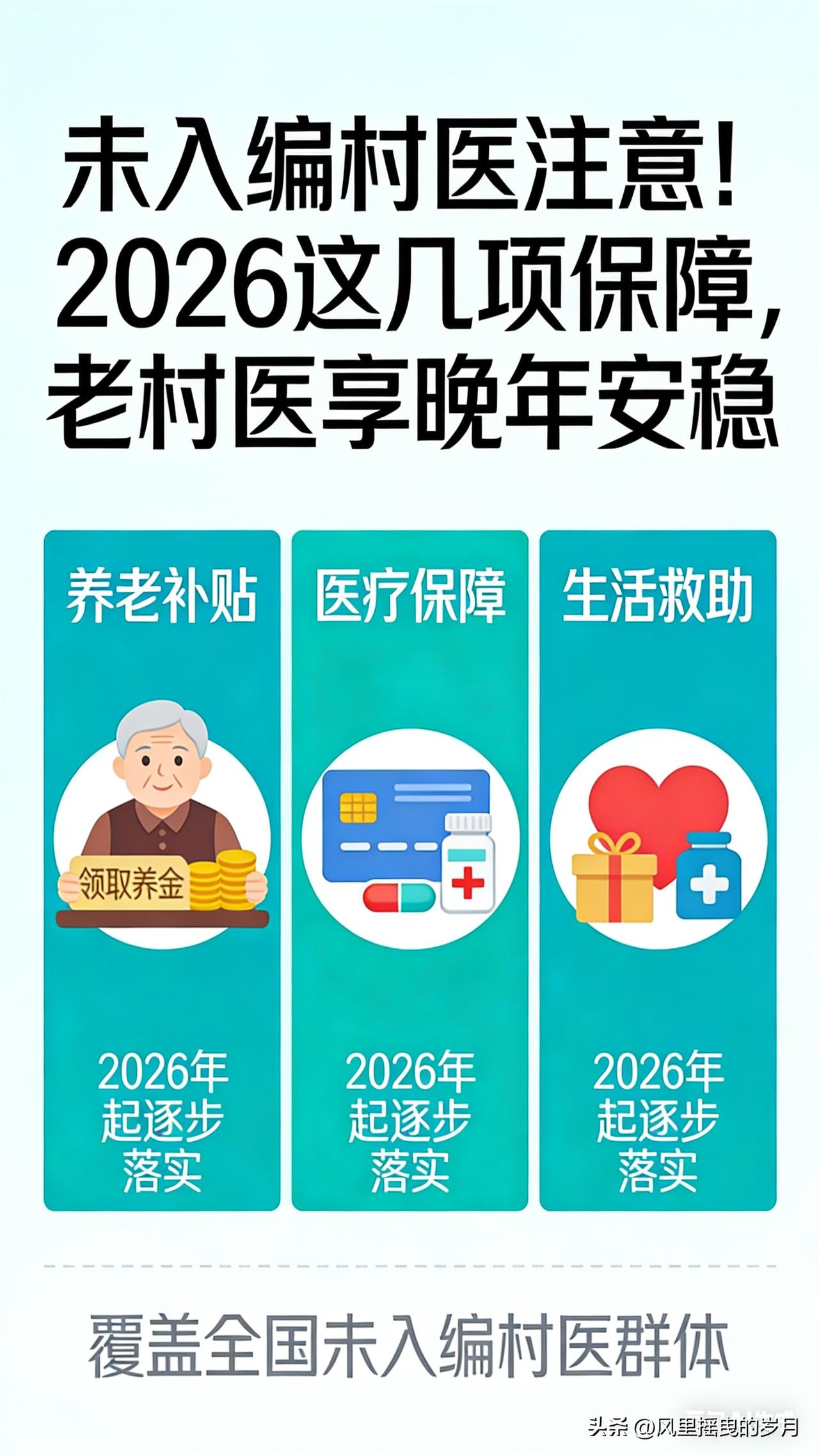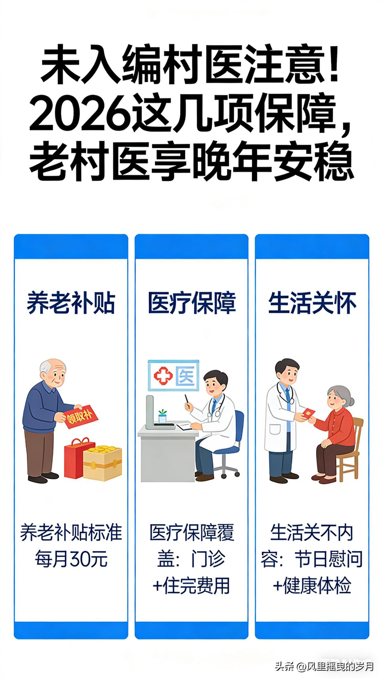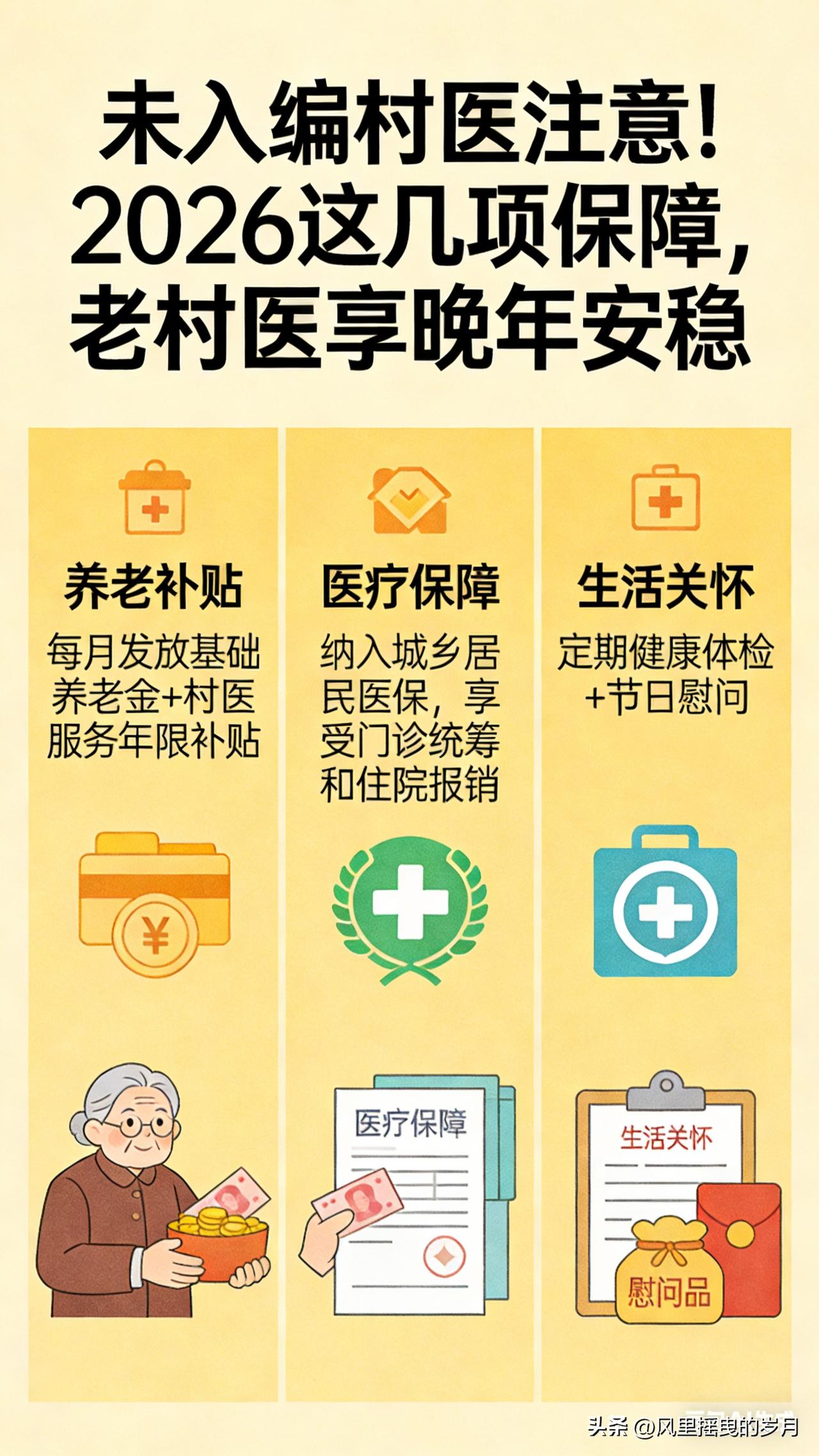 这篇文章聚焦未入编村医,把2026年养老、参保、离岗补助、在岗保障讲清楚,好读好懂、方便转发。 未入编村医注意!2026这几项保障,老村医享晚年安稳 扎根乡村行医多年,没编制、保障弱、晚年心里不踏实,是很多村医的共同心事。2026年,国家与地方密集落地村医保障新政,未入编村医不再“老无所依”,养老、参保、离岗补助、在岗福利全面升级,让坚守基层的老村医,稳稳守住晚年幸福。 一、养老保险全覆盖:未入编也能参保,财政给补贴 过去未入编村医只能自己缴居民养老,待遇低、没底气。2026年全国推行分类参保、应保尽保,彻底打通保障通道: - 乡聘村用、签劳动合同:纳入企业职工养老保险,单位缴费部分由财政与乡镇卫生院承担,个人仅缴小头,缴满年限到龄领职工养老金。 - 未纳入职工养老:统一参加城乡居民养老保险,多地财政给予缴费补贴,减轻个人负担。 - 补缴通道开放:符合条件的未入编村医,可按规定补缴养老保险,补齐缴费年限、提升退休待遇。 政策明确:2026年实现符合条件村医全员参保,不让任何一位老村医落在保障外。 二、离岗生活补助:到龄就领,工龄越久领越多 年满60周岁(部分地区女性55周岁)、正常退出岗位、累计执业满10年(部分地区满3年即可享基础补助),经卫健部门认定,就能按月领离岗生活补助,这是老村医的专属“养老红包”。 补助标准全国统筹、地方细化,多按工龄阶梯计发,服务年限越长、补助越高,部分省份标准如下: - 山东:每满1年补20元,不设上限,月补不低于300元; - 安徽:按工龄分档,月补48元—528元,财政足额拨付; - 海南、吉林、河南:符合条件离岗村医,月补不低于300元; - 宁国等地:满30年工龄,月补超480元,长期奉献者重点倾斜。 即便早年证件不全,只要能提供村委会、乡镇卫生院从业证明,工龄同样认可,不埋没每一份乡村坚守。 三、入编与待遇升级:未入编也能享“同工同酬” 未入编不代表没前途,2026年村医职业通道全面拓宽: - 乡聘村用常态化:未入编村医纳入乡镇卫生院统一管理,工资参照在编人员发放,收入有保底、不拖欠; - 考核入编绿色通道:连续执业6—10年、取得执业(助理)医师资格、群众口碑好的村医,可通过考核直接入编,纳入事业编制管理; - 收入多渠道保障:基本公卫补助、基本药物补助、一般诊疗费全额落实,艰苦边远地区额外增发补贴,收入不低于当地农村居民人均可支配收入。 四、在岗暖心保障:执业更安心,健康有守护 除了养老“大头”,未入编村医还能享受多项贴心福利: - 统一购险:乡镇卫生院统一购买医疗责任险、人身意外险,降低执业风险; - 免费体检:定期安排健康体检,守护村医自身健康; - 技能培训:免费参加执业能力提升培训,助力持证上岗、职业进阶; - 困难帮扶:高龄、独居、患病的困难村医,纳入乡镇重点关怀对象,给予临时救助与生活帮扶。 五、申领小贴士:少跑腿、快兑现 1. 携带身份证、社保卡、村医执业证(或从业证明)、离岗证明,到乡镇卫生院或卫健办办理; 2. 工龄认定以官方备案为准,缺失材料可由村委会、老同事佐证; 3. 补助按月发放至社保卡,财政兜底、无拖欠,部分地区实现线上申请、一键查询。 从“赤脚行医”到“保障兜底”,2026年的村医保障新政,真正兑现**“不让奉献者流血流汗又流泪”**的承诺。未入编村医们请放心,多年坚守不会被辜负,养老有依靠、晚年有尊严,安心行医、安稳养老,这是国家给基层医者最实在的定心丸。