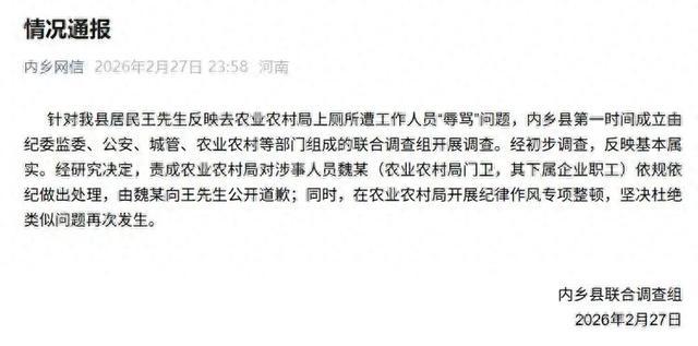 河南内乡县一居民在农业农村局上厕所遭工作人员“辱骂”,官方通报:反映基本属实,对涉事人员依规依纪做出处理