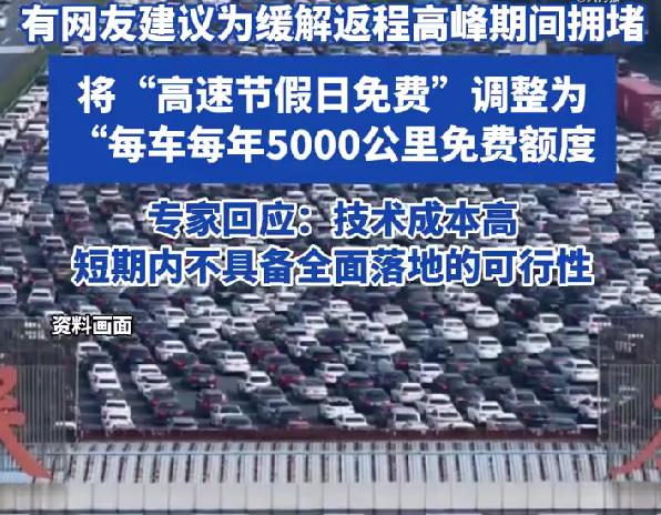 司机差5秒错过高速免费多付1700元,网友建议免费5000公里遭专家回应 2月27日,一则高速出行的新闻引发全网热议,一名司机从新疆喀什自驾到重庆,仅因差5秒错过高速免费时间,就多支付了1700余元通行费。 据当事人讲述,当时他们赶到收费站时,前面一辆车刚好顺利通过,可轮到自己时,免费时间刚好结束,就差短短5秒,既无奈又可惜。 要知道,从新疆喀什到重庆全程约3700多公里,自驾要42小时以上,正常高速费就约1724元,这5秒的差距,相当于白多花了一笔巨款。 当事人还坦言,出发前本以为能赶上免费末班车,谁料路上些许耽搁,最终因几秒之差遗憾错过,事后又好气又好笑,只能当长个教训。 这件事曝光后,网友们纷纷共情,毕竟每到节假日高速免费末期,总有车主因卡点失败多花钱,类似的遗憾案例不在少数。 为此,有网友提出了一个建议:将现行的“高速节假日免费”,调整为“每车每年5000公里免费额度”,以此缓解返程高峰的拥堵。 网友们认为,这样的调整能让车主自主安排免费出行时间,不用再为了卡点赶高速,既减少拥堵,也能避免因几秒之差多花钱的遗憾。 面对这个建议,专家很快给出了回应,明确表示该建议技术成本高,受多重因素制约,短期内不具备全面落地的可行性。 专家解释,实行每车每年5000公里免费额度,需要搭建全国统一的额度管理平台,还要解决数据对接、隐私保护等诸多难题。 而且现行高速免费政策的初衷,是拉动假日消费、促进人员流动,若改为里程免费,可能会违背这一核心初衷,难以兼顾多方利益。 还有专家补充,节假日高速拥堵的根本原因,是全国性潮汐式集中出行需求与路网承载能力的错配,并非免费政策本身。 其实不止这一位司机,此前也有车主因晚几秒、十几秒错过免费时间,多付数百上千元,每次都能引发大家对政策优化的讨论。 交通部门也给出提醒,建议车主尽量提前规划返程时间,避免卡点出行,也可采用“先下后上”策略,减少因错过免费时段造成的损失。 网友们对此议论纷纷,有人支持专家观点,认为技术难度太大,短期内难以实现;也有人坚持自己的建议,希望政策能更人性化。 还有人提出折中方案,比如推行“驶入时间认定”,只要在免费时段驶入高速,即便出口超时,也可享受部分减免,增加政策弹性。 据悉,全国人大代表也曾建议过优化高速免费政策,推行“多选免费”机制,让车主自主选择免费时段,可先试点再推广。 高速免费政策的核心是惠民,优化调整需要兼顾可行性与公平性,不必急于求成,循序渐进才能真正惠及每一位车主。