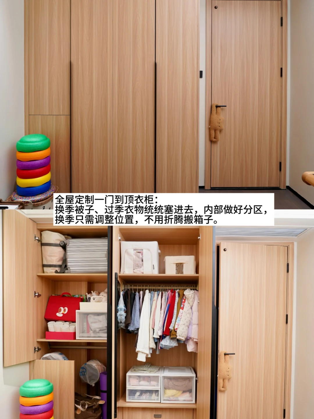 🛏 全屋定制衣柜:卧室衣柜做到顶,一门到顶简洁利落。孩子的换季被子、衣物、玩具囤货统统塞进去。