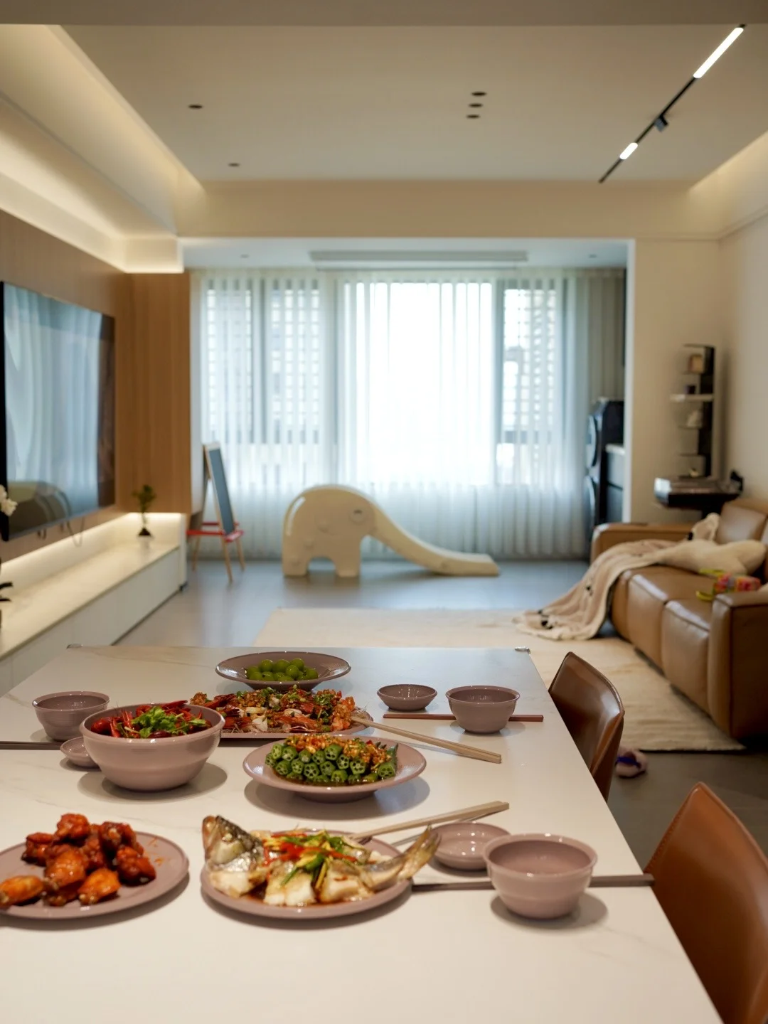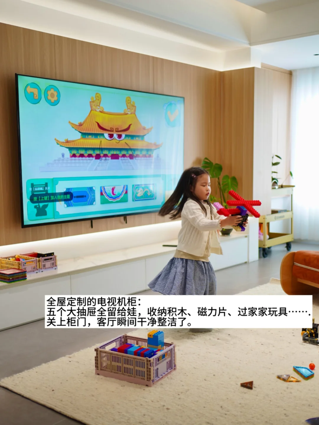 📺 电视机柜:电视下面做了一排柜子,五个大抽屉全留给娃,收纳积木、磁力片、过家家玩具……关上门,客厅瞬间干净。高频玩具放抽屉,娃自己好拿;低频的放高处柜子,定期轮换。