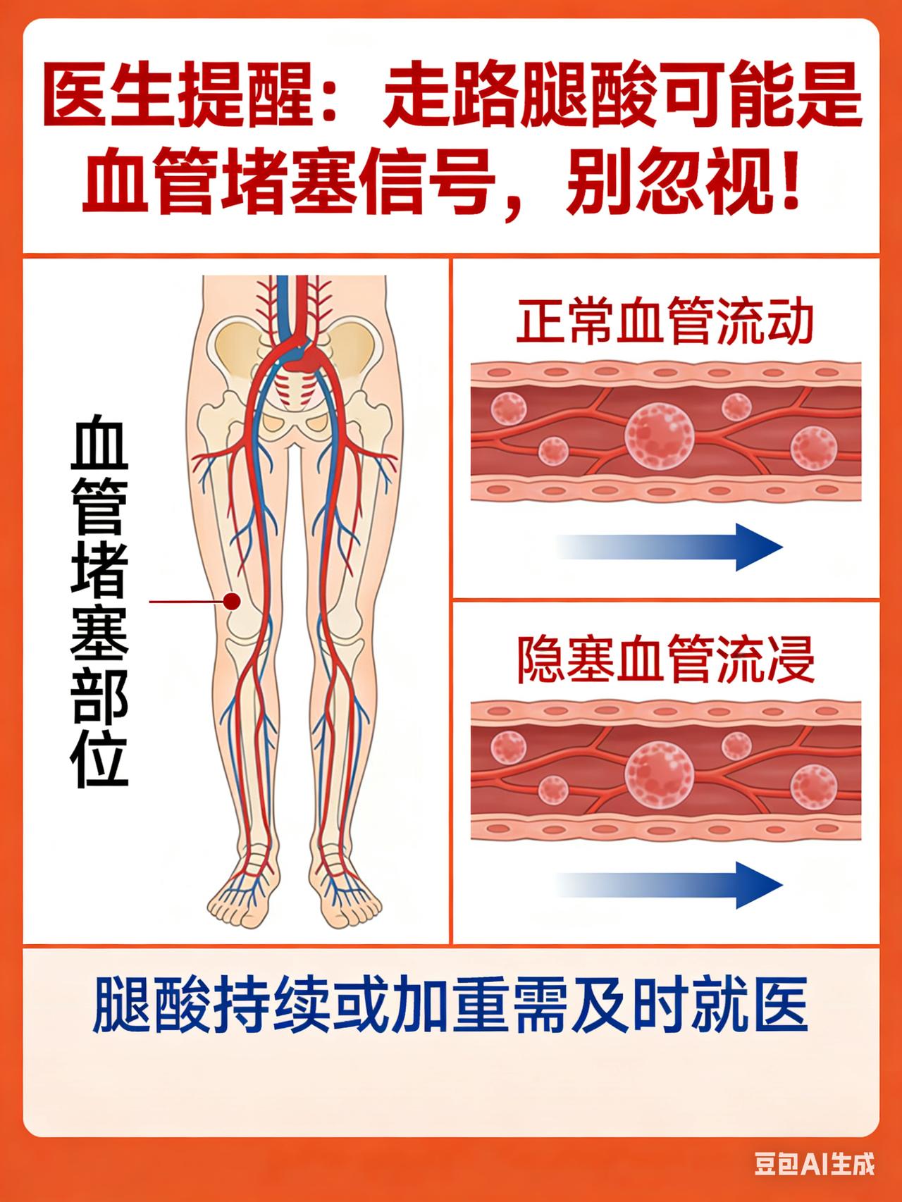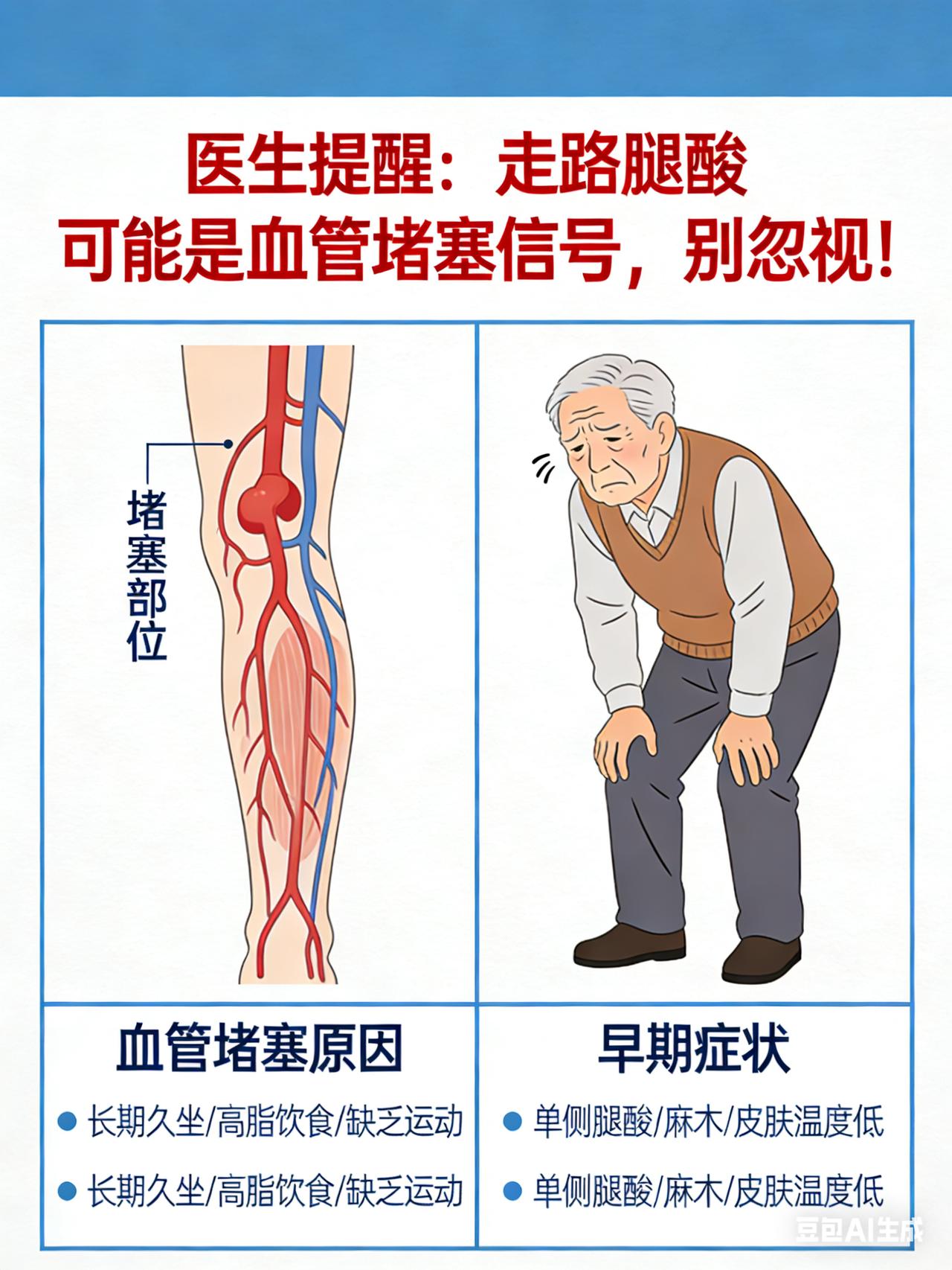 医生提醒:走路腿酸可能是血管堵塞信号,别忽视! 血管“堵车”警报:走几步腿就酸,你的身体在喊“救命”! 你是否有过这样的“诡异”经历:明明没爬几层楼、没走多远路,双腿却像被施了魔法一般,突然酸痛、乏力,每挪一步都像踩在刀尖上,非得停下来歇好久才能缓过劲儿。很多人对此不以为意,觉得不过是年纪大了、缺乏锻炼,或是当天太累罢了。但你知道吗?这极有可能是你身体里的血管在疯狂“拉警报”,尤其是下肢血管堵塞,就像一条原本畅通无阻的高速公路突然遭遇严重堵车,若不及时处理,后果不堪设想! 血管,堪称人体的“生命通道”,它们如同四通八达的交通网络,日夜不停地为身体的各个角落输送氧气和营养物质,维持着我们的正常生理功能。然而,当血管被各种“垃圾”——如胆固醇、甘油三酯等堆积形成斑块,或者血栓突然“作祟”,这条“生命通道”就会变得狭窄甚至完全阻塞。 腿部肌肉在行走时就像一台高速运转的机器,需要消耗大量的能量,对血液的需求也呈几何倍数增长。可堵塞的血管却像个吝啬鬼,无法为肌肉提供充足的“燃料”——氧气和营养物质。肌肉无奈之下只能进行无氧代谢,就像汽车在没油的情况下强行启动,会产生大量乳酸等代谢产物。这些“废物”不断堆积,就像一群调皮的小精灵在神经末梢上捣乱,从而引发酸痛、乏力等症状,让你苦不堪言。 这种因血管堵塞导致的腿部酸痛,就像一个神秘的“信号灯”,有着独特的表现。它通常在你行走一段特定距离后准时亮起,比如走上几百米或者十几分钟,而且酸痛部位多集中在小腿这个“重灾区”,有时也会像小恶魔一样向上蔓延至大腿。当你停下来休息片刻,就像给堵塞的血管按下了“暂停键”,症状会逐渐减轻直至消失。但只要你再次迈开脚步,它又会像个顽固的敌人一样卷土重来。随着血管堵塞程度的不断加重,你能行走的距离会越来越短,酸痛的症状也会愈发严重,仿佛在无情地宣告:“你的血管问题越来越严重啦!” 除了腿部酸痛这个“主角”,血管堵塞还可能拉来一群“帮凶”。比如腿部皮肤温度降低,摸上去凉飕飕的,就像冬天里没穿棉裤的感觉;颜色变得苍白或发紫,失去了原本的红润光泽,仿佛被抽走了生命的色彩;脚毛脱落,脚趾甲生长缓慢,就像植物失去了养分,生长变得迟缓。严重时,甚至会出现腿部溃疡、坏疽等情况,就像身体上出现了一个个“黑洞”,若不及时治疗,可能面临截肢的风险,让你的人生从此陷入黑暗。 如果你的双腿经常发出这样的“求救信号”,千万别犹豫,赶紧前往医院就诊。医生会通过血管超声、CT血管造影等“火眼金睛”,精准地找出血管堵塞的程度和位置。早期发现、早期治疗,就像及时疏通堵塞的公路,通过药物治疗、手术治疗等方式改善血管堵塞状况,能有效预防严重并发症的发生,让你的血管重新恢复畅通无阻,让你的双腿重新拥有轻盈自如的步伐,继续书写美好的人生篇章!