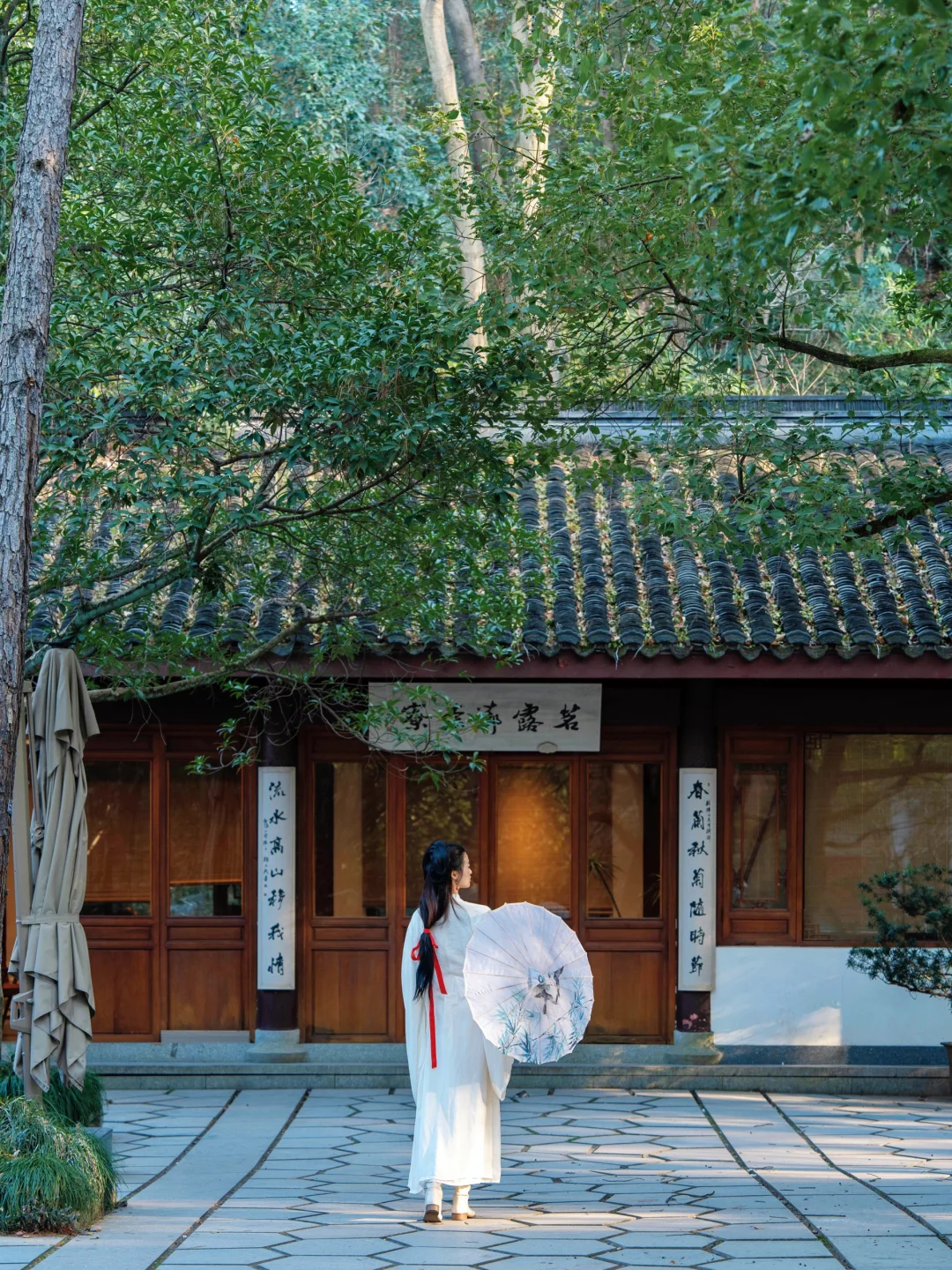 万松书院是过去梁山伯与祝英台读书谈恋爱的地方,冬天也是满满绿色,红墙黛瓦掩映在绿荫里