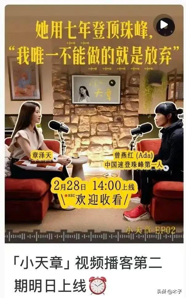 全网嘲“没接住刘嘉玲、豪门阔太玩票”的章泽天,停更45天,杀回来了! 1月她的首档个人播客《小天章》上线,直接请到刘嘉玲坐镇,上线两天全平台订阅破20万,热度直接拉满。但随之而来的是铺天盖地的群嘲:全程被刘嘉玲压着打,提问没深度、接不住梗,像个陪聊的小粉丝,甚至不少人直接断言“这播客活不过第二期,就是阔太闲得慌的玩票”。 谁都没想到,被全网唱衰的她,停更45天后,不仅没偃旗息鼓,反而带着第二期预告,直接打了所有人的脸。 这次她没再蹭顶流人脉,没请明星大咖,嘉宾选得让所有人意外——中国女性速登珠峰第一人,曾燕红。 不是什么自带流量的名人,就是个曾经的中学语文老师。为了鼓励学生“敢做梦”,40岁定下攀登珠峰的目标,三闯珠峰,经历过雪崩、地震重伤、差点丢了命,硬生生从零基础练到专业登山者。最终在2021年,她用25小时50分钟极速登顶珠峰,把女性速登珠峰的世界纪录,直接缩短了近5个小时。 从影后刘嘉玲,到登山英雄曾燕红,两期嘉宾的跨度,直接戳破了所有人对她的刻板印象。 之前大家总觉得,她是“奶茶妹妹”,是“京东老板娘”,一辈子活在标签里,做播客也不过是靠人脉玩票。但这次她选的嘉宾,是不靠家世、不靠流量,全靠自己拿命拼出传奇的普通女性,内容核心也从“豪门阔太的社交局”,落到了真正的女性成长、人生选择上。 预告一出,之前唱衰的网友直接改了口:“终于找对方向了!不蹭明星人脉,讲真正的女性故事,这才是这档播客该有的样子”“停更的45天,她是真的在反思调整,不是破罐子破摔”。 说真的,比起靠人脉堆出来的明星对谈,这种藏在普通人身上的传奇人生,才真的有戳中人心的力量。