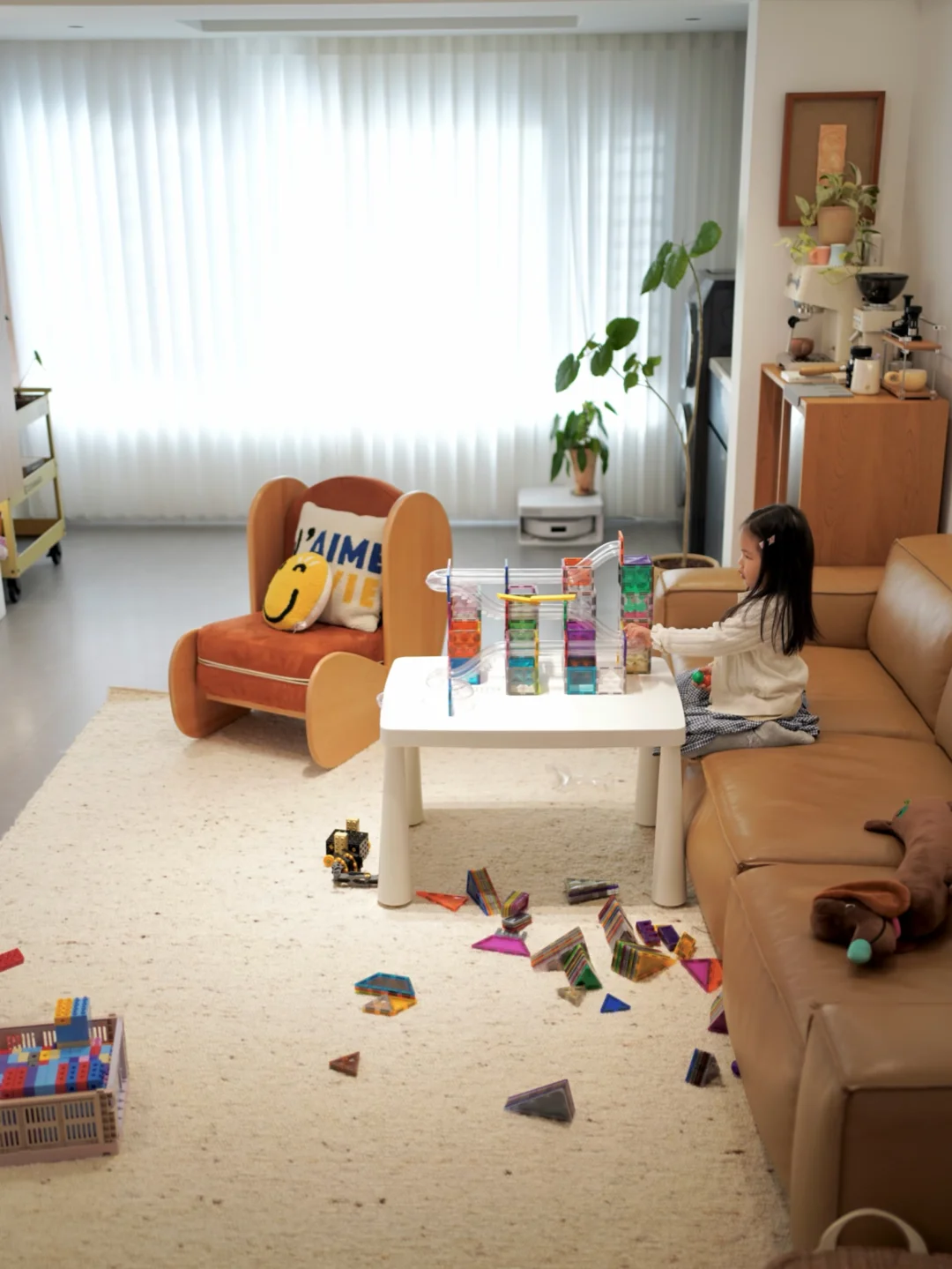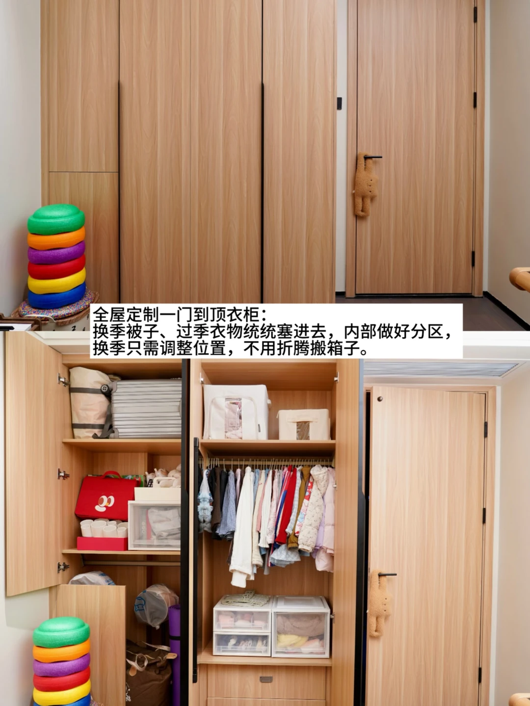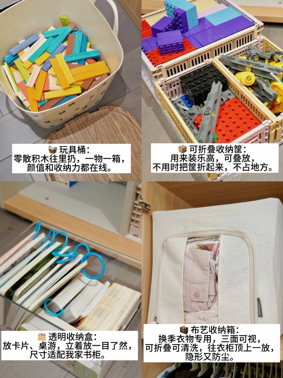 经常有朋友问:“你家真有5岁娃?怎么这么干净?” 我家套内100平三室两厅,住进来三年多,确实没乱过。今天分享我家的收纳思路,给有娃家庭参考: --- 1️⃣硬装阶段:能藏的都藏起来 小户型,客厅是娃活动最久的地方,我干脆做了留白——没有大茶几,铺块地毯就是游乐场,跑来跑去随便折腾。 📺 电视机柜:电视下面做了一排柜子,五个大抽屉全留给娃,收纳积木、磁力片、过家家玩具……关上门,客厅瞬间干净。高频玩具放抽屉,娃自己好拿;低频的放高处柜子,定期轮换。 🛏 全屋定制衣柜:卧室衣柜做到顶,一门到顶简洁利落。孩子的换季被子、衣物、玩具囤货统统塞进去。 📒核心思路:80%杂物藏进柜子,露出的只有20%常用品。 --- 2️⃣软装阶段:根据需求添置收纳家具,慢慢添置,选可拓展、一物多用的利用率更高。 📚模块书柜:随着孩子的绘本、玩具越来越多,给儿童房添了三组模块书柜,高68cm,宽80-120cm,5岁娃伸手就能够到。可灵活组合,之后还能上下堆叠或左右添加。 🪜 双层床梯柜:当初选这款床,就看中这个梯子,既是台阶也是抽屉,收纳不占额外空间,动线特别顺。 --- 3️⃣平价收纳好物 🧺 玩具桶:几十块一个,零散积木往里扔,一物一箱,颜值和收纳力都在线。 📦 可折叠收纳筐:用来装乐高,可叠放,不用时把筐折起来,不占地方。 🗂️ 透明收纳盒:放卡片、桌游,立着放一目了然,尺寸适配我家书柜。 🧳 布艺收纳箱:换季衣物专用,三面透明看得清,可折叠可清洗,往衣柜顶上一放,隐形又防尘。 --- 4️⃣比收纳设计更重要的:培养孩子的收纳习惯 工具再好,孩子只会往外拿不会往回放,家里照样乱。我从女儿3岁开始做一件事:玩具玩完必须“送回家”。 📸 操作很简单: - 每个收纳筐贴上对应照片(积木筐贴积木照片) - 刚开始陪着她一起收:“积木要回积木的家啦” - 收完击掌夸奖:“今天把乐高按颜色分好,好厉害!” 现在她5岁,自己收玩具比我还利索。 有娃家庭想保持整洁,我的经验是: 硬装时多做柜子,把乱糟糟的东西藏起来;软装时选对家具,让娃自己好拿好收;同时培养孩子的收纳习惯养起来。那家里像乱都难✨