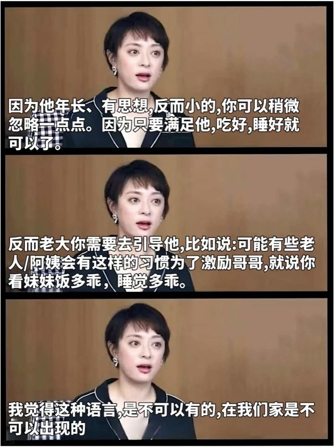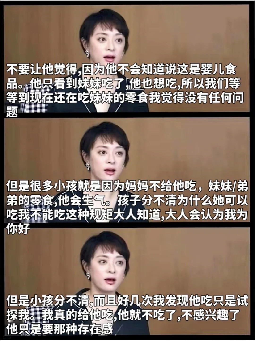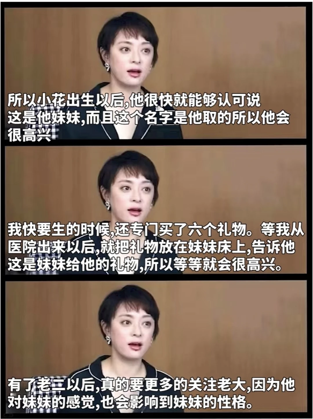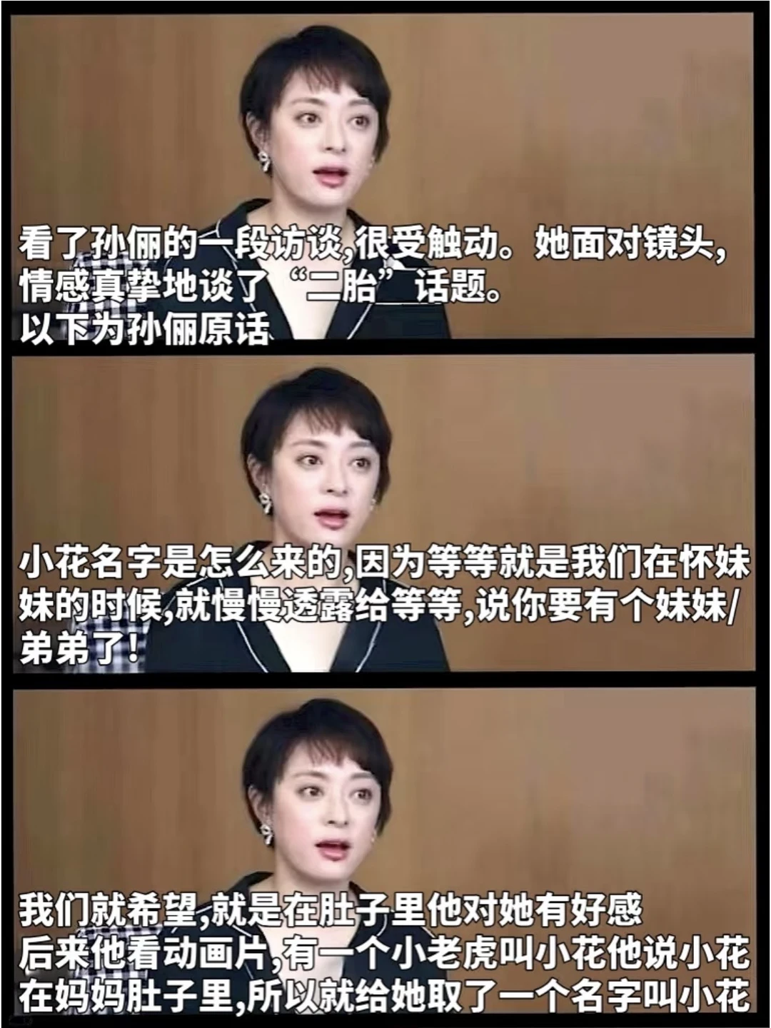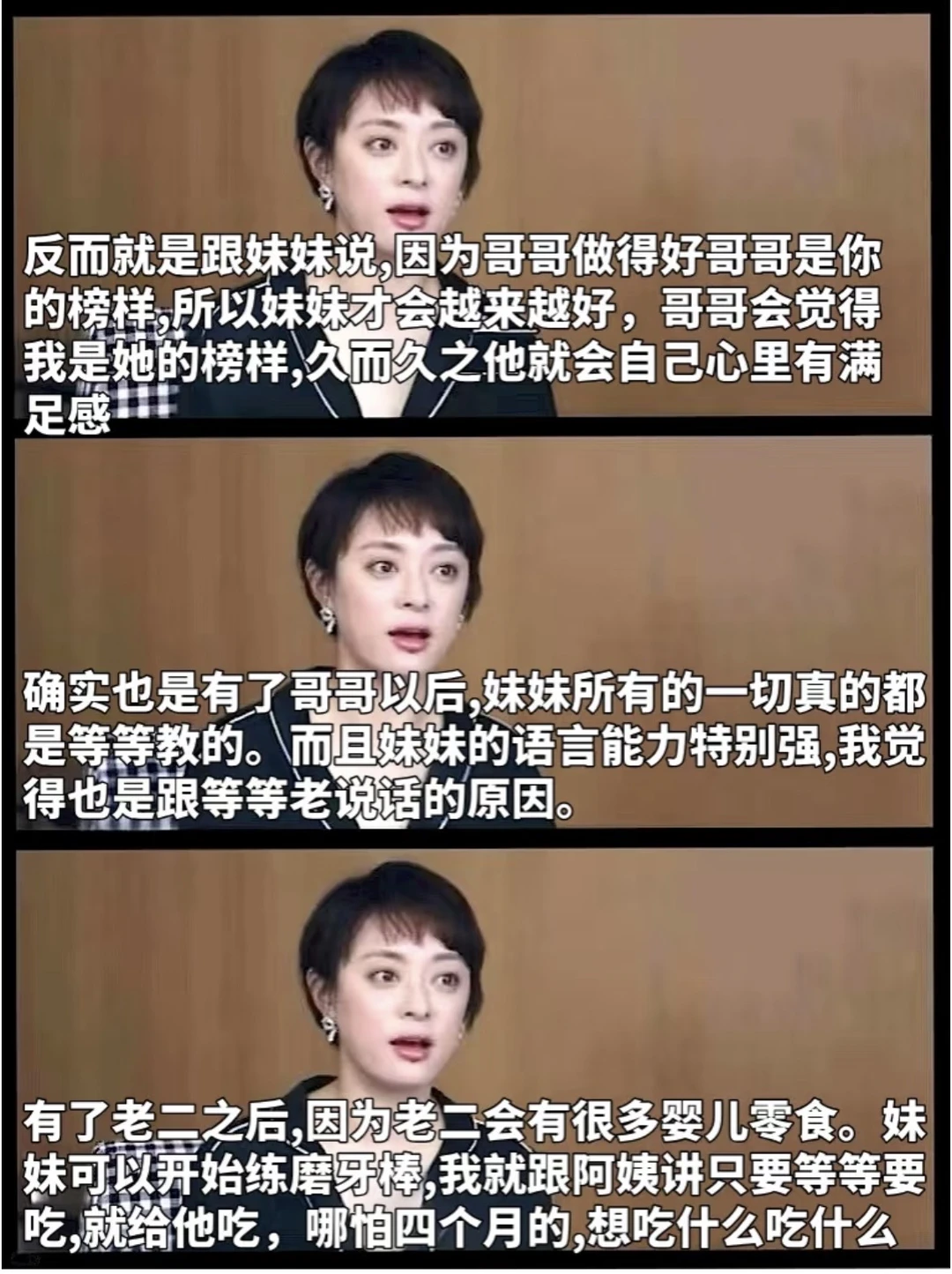 这几天,看了孙俪的一段访谈,很受触动。 她很会养孩子,生了二胎也不忽略老大的感受。 · 🌟以下是孙俪原话: ✅让大宝拥有参与感 小花(孙俪闺女)的名字,是等等(孙俪儿子)起的。 我们在怀妹妹的时候,慢慢透露给等等,说你要有妹妹/弟弟了。 我们希望,就是在肚子里他对她有好感。 后来他看动画片,有一个老虎叫小花,他说小花在妈妈肚子里,所以就给她取了一个名字叫小花。 所以小花出生以后,他很快就能认可说: 这是他妹妹,而且这个名字是他取的,所以他会很高兴。 · ✅重视大宝陪伴,适当忽略二宝 我快要生的时候,还专门买了一个礼物。 等我从医院出来以后,就把礼物放在妹妹床上,告诉他这是妹妹给他的礼物,所以等等就会很高兴。 有了老二以后,真的要更多的关 注老大,因为他对妹妹的感觉,也会影响到妹妹的性格。 因为他年长、有思想,反而小的,你可以稍微忽略一点点。因为只要满足她,吃好、睡好就可以了。 反而老大你需要去引导他,比如说: 可能有些老人/阿姨会有这样的习惯,为了激励哥哥,就说你看妹妹吃饭多乖,睡觉多乖。 我觉得这种语言,是不可以有的,在我们家是不可以出现的。 反而就是跟妹妹说,因为哥哥做得好,哥哥是你的榜样,所以妹妹才会越来越好。 哥哥会觉得我是她的榜样,久而久之,他就会自己心里有满足感。 确实也是有了哥哥以后,妹妹所有的一切,真的都是等等教的。 而且妹妹的语言能力特别强,我觉得也是跟等等老说话的原因。 · ✅食物玩具完全平等 有了老二之后,因为老二会有很多婴儿零食。 妹妹可以开始练磨牙棒,我就跟阿姨讲只要等等要吃,就给他吃。 哪怕四个月的,想吃什么吃什么。 不要让他觉得,因为他不会知道说这是婴儿食品。 他只看到妹妹吃了,他也想吃。 所以我们等等到现在还在吃妹妹的零食,我觉得没有任何问题。 但是很多小孩就是因为妈妈不给他吃,妹妹/弟弟的零食,他会生气。 孩子分不清为什么她可以吃我不能吃,这种规矩大人知道,大人会认为我为你好。 但是小孩分不清,而且好几次我发现他吃只是试探我。 我真的给他吃,他就不吃了,不感兴趣了,他只是要那种存在感。 ·
