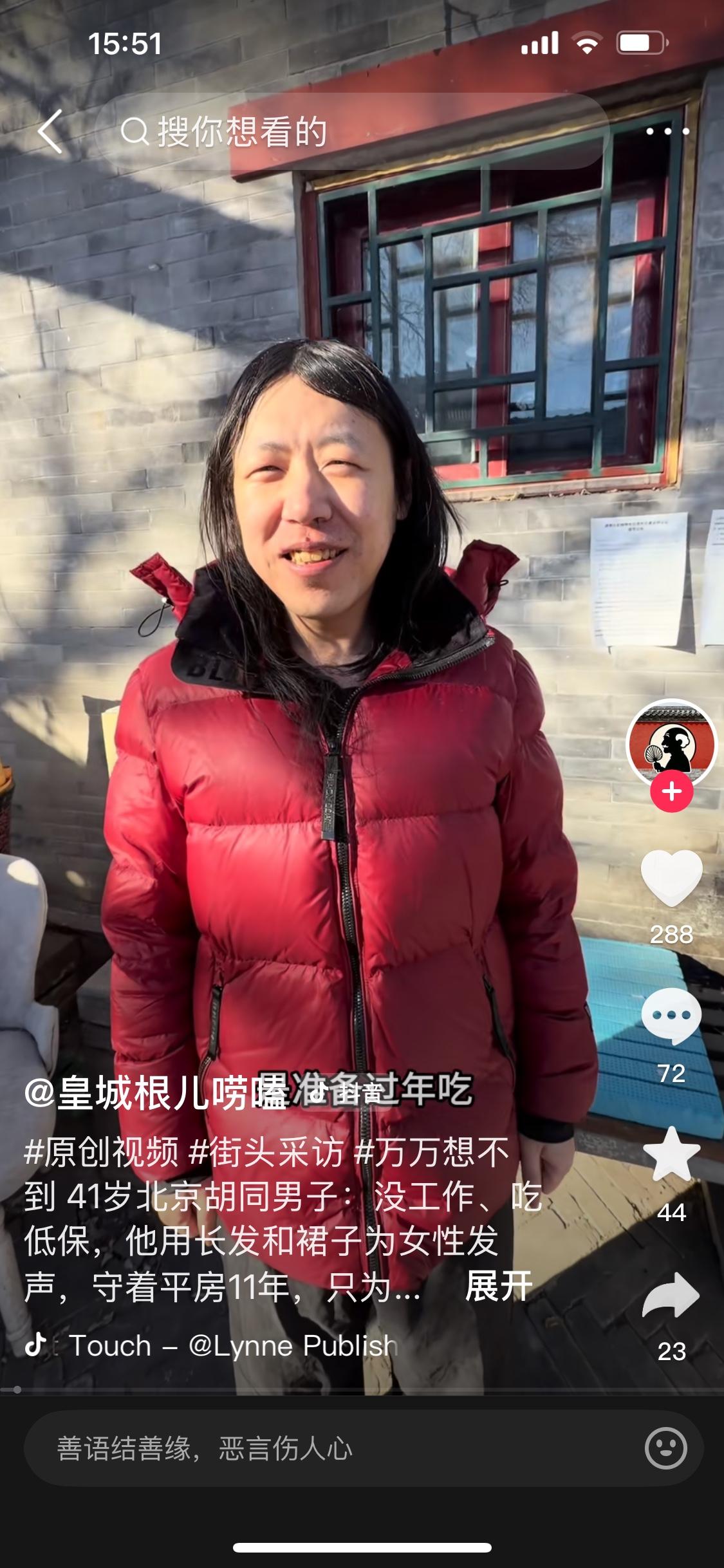 今天看了个视频,北京胡同一个41岁的小伙,毛班不找,说无法融入社会,打小就和母亲住姥姥家那大杂院中的十平左右小房,姥姥、母亲相继去世后,他领取北京最低社保1480元,每天自己买点挂面或烧饼菜叶将就活着,健康的有手有脚的,网友评论,花着纳税人的钱养着一帮不干活吃闲饭的,看着就让人生气😡北京单身男青年