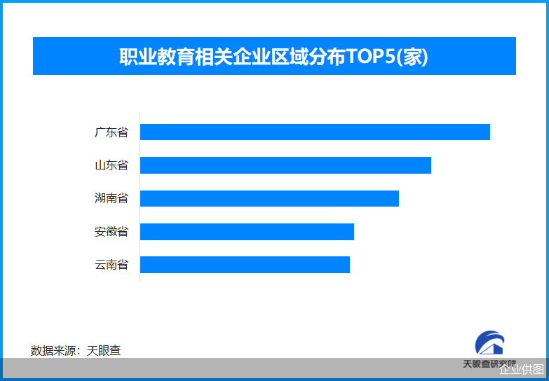 天眼查专业版数据显示,截至目前我国现存在业、存续状态的职业教育相关企业超1万家。从区域分布来看,广东省、山东省、湖南省职业教育相关企业数量位居前列,分别拥有超1100余家、950余家和840余家。
