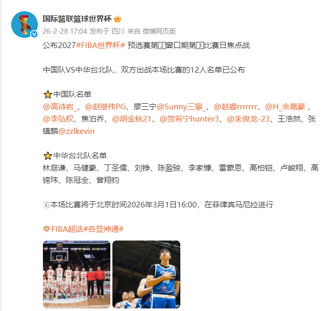 据,世预赛亚洲区#中国男篮vs中国台北男篮# 双方12人大名单出炉。中国男篮的12人名单较上一场没有变动,而中国台北的名单据此前消息,游艾喆将顶替受伤的马建豪进入大名单,这份名单似乎还未更新。