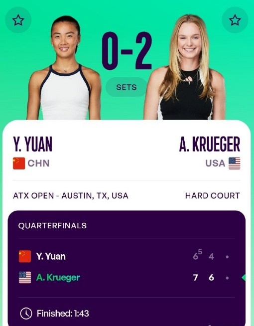 直播吧2月28日讯WTA250奥斯汀站1/4决赛,前赛会冠军袁悦以6-7(5)4-6不敌克鲁格,无缘四强。